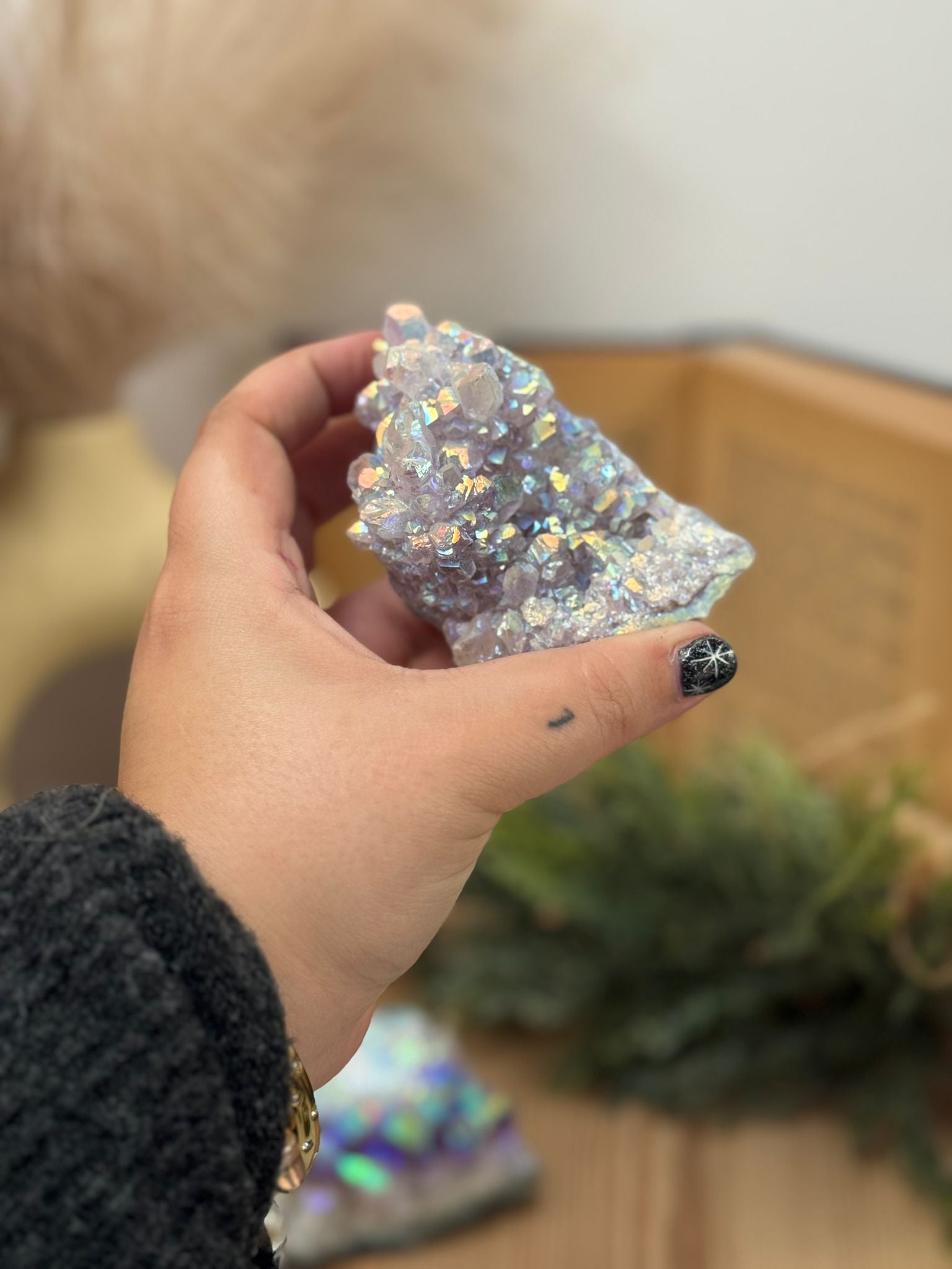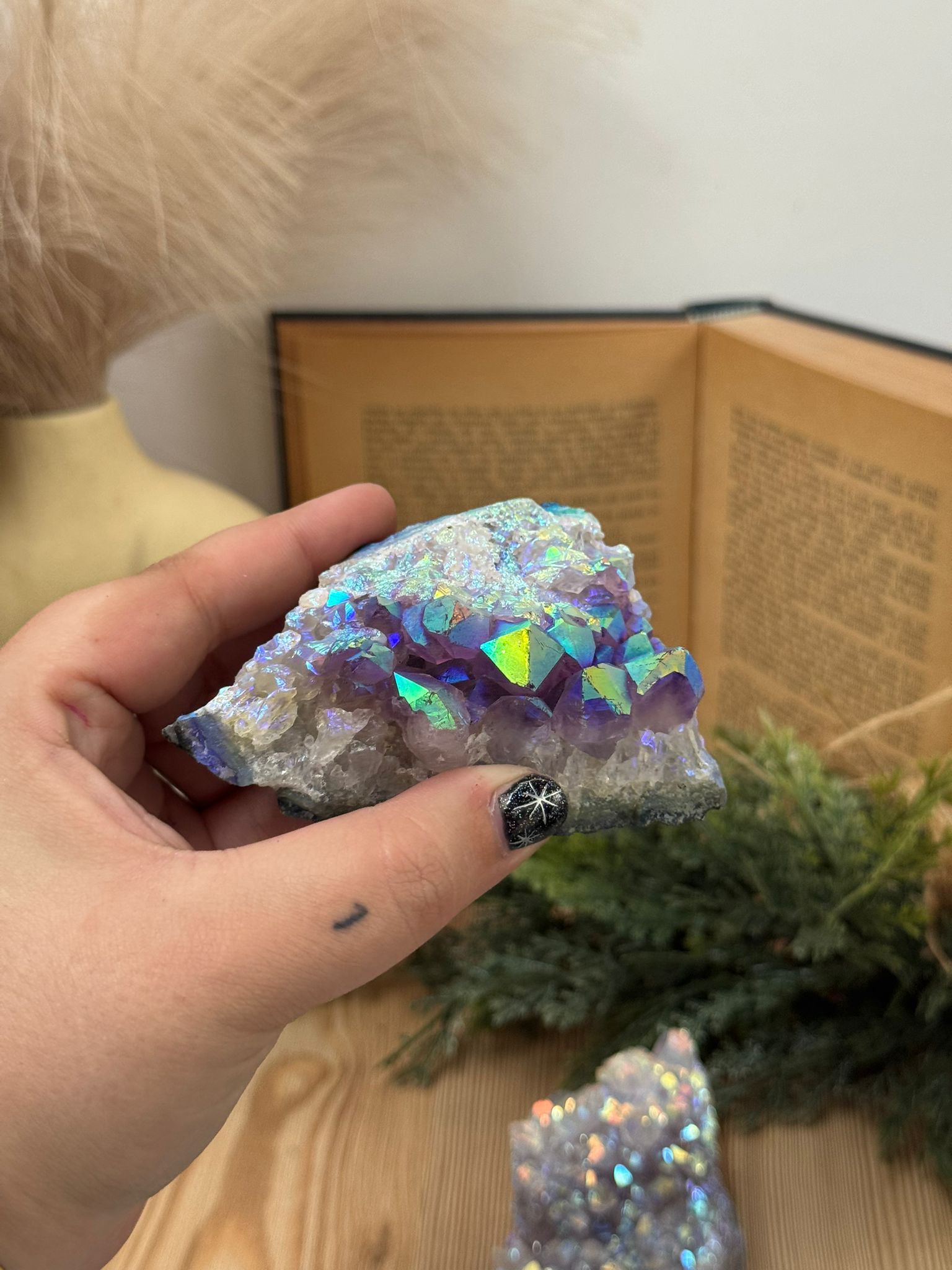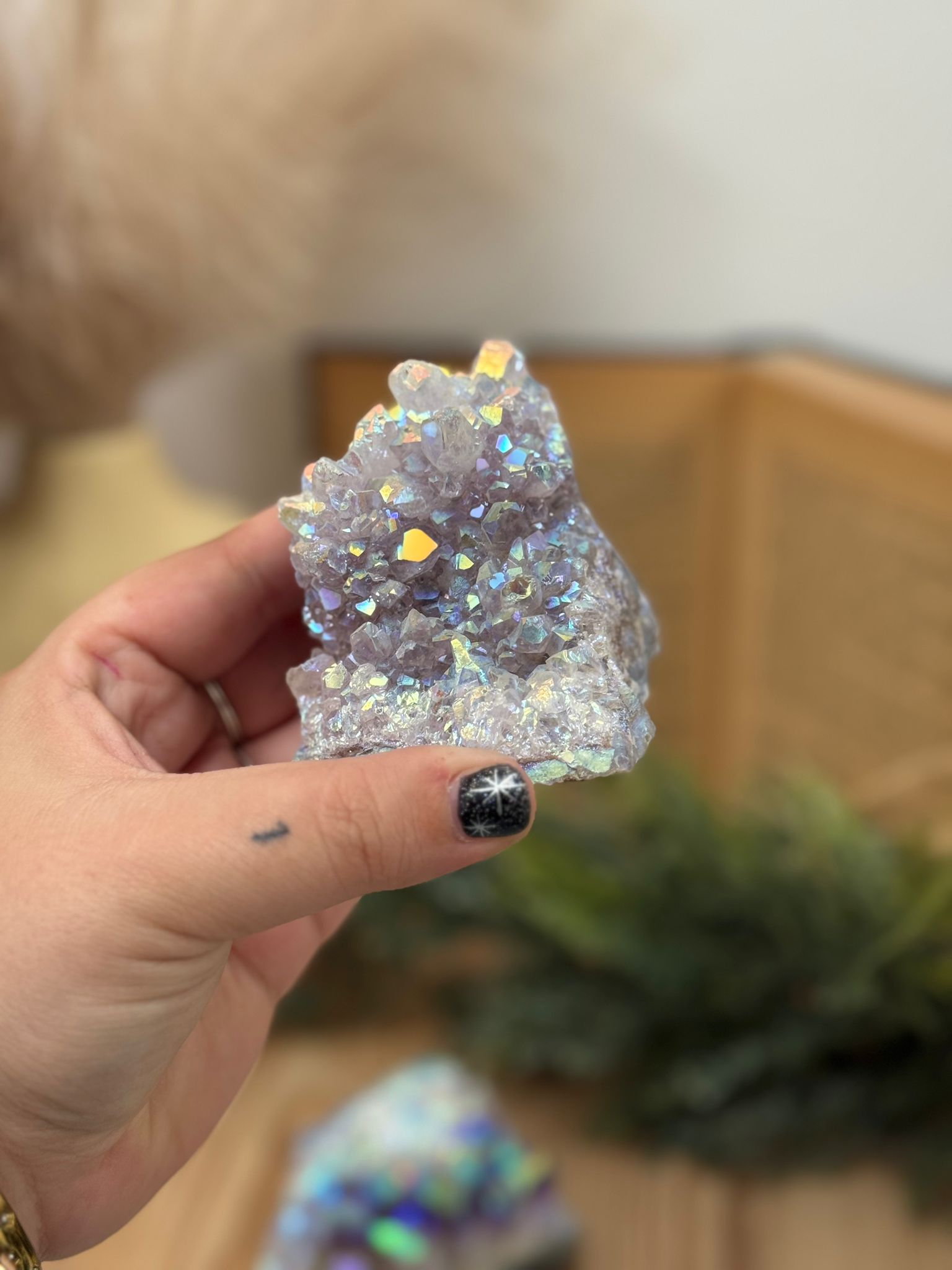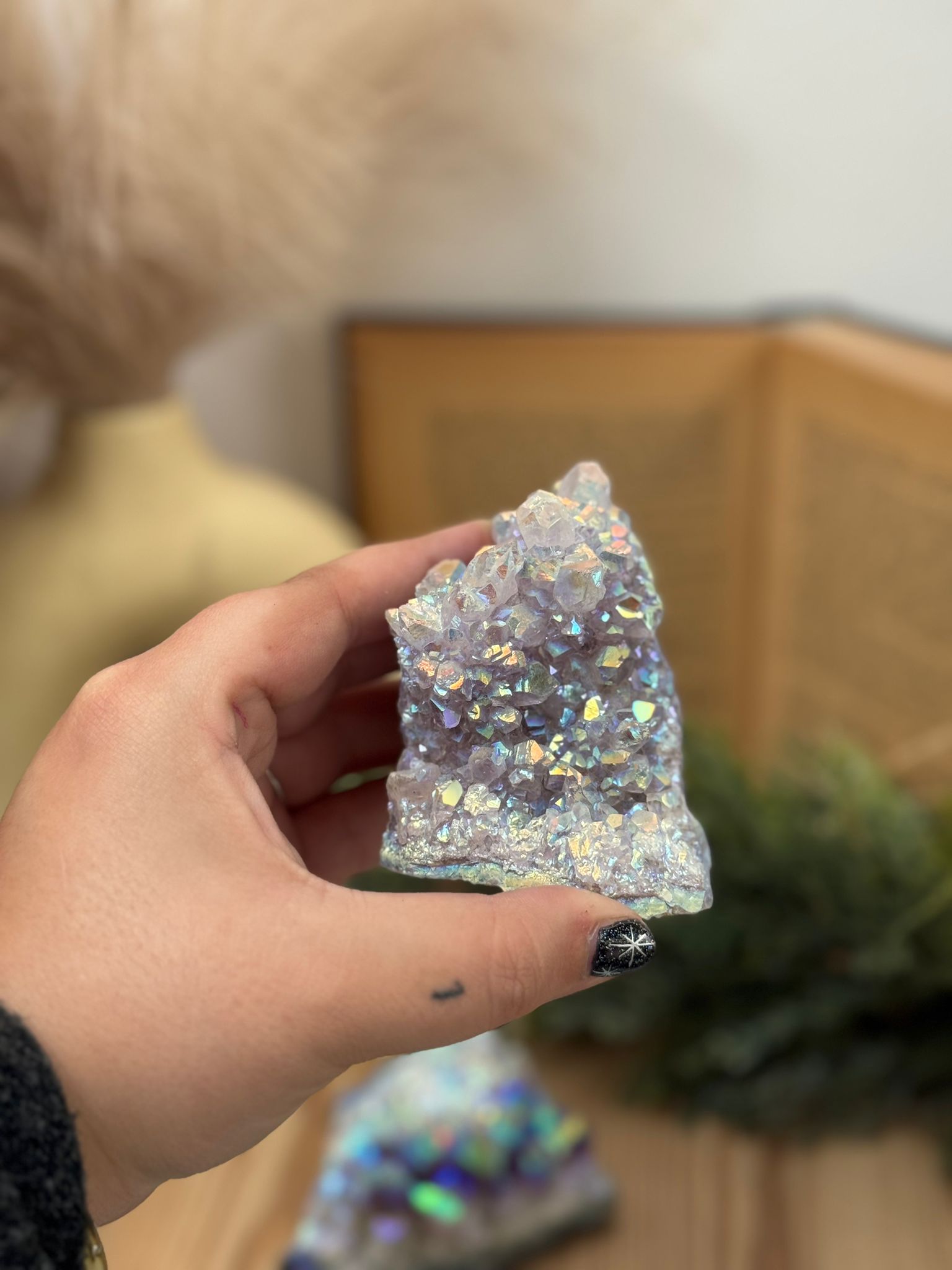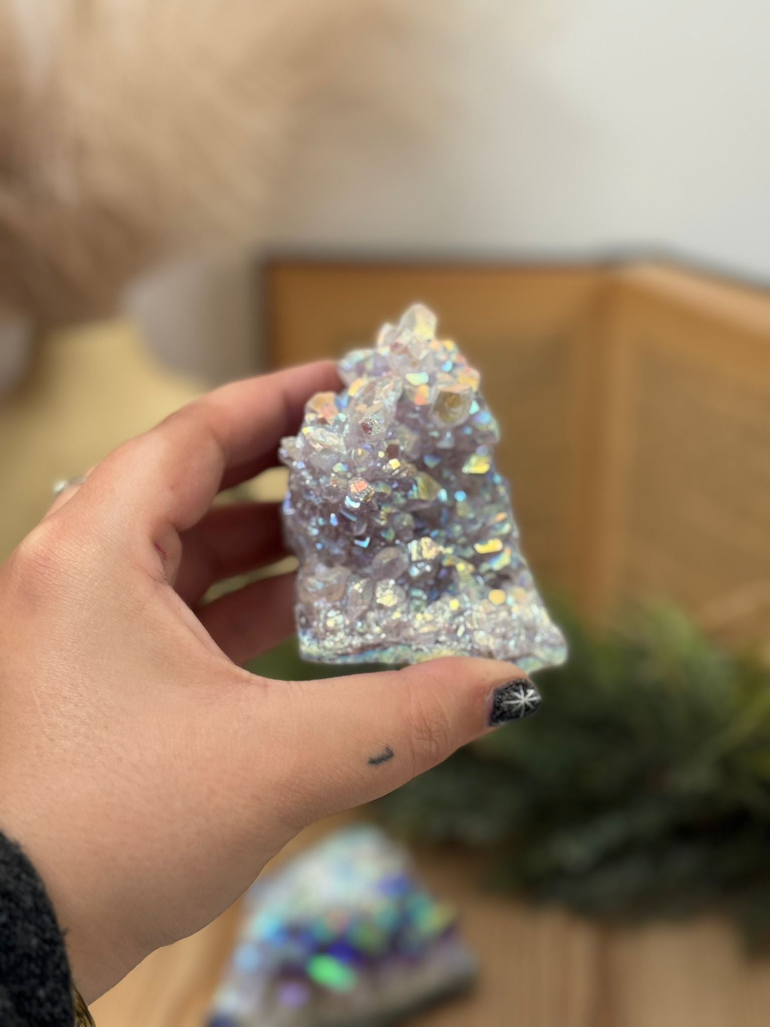 Cada figura está cuidadosamente tallada a mano, mostrando la belleza natural del cristal con sus tonalidades violetas y destellos característicos. Es perfecta para altares, espacios de meditación o como amuleto protector en el hogar.