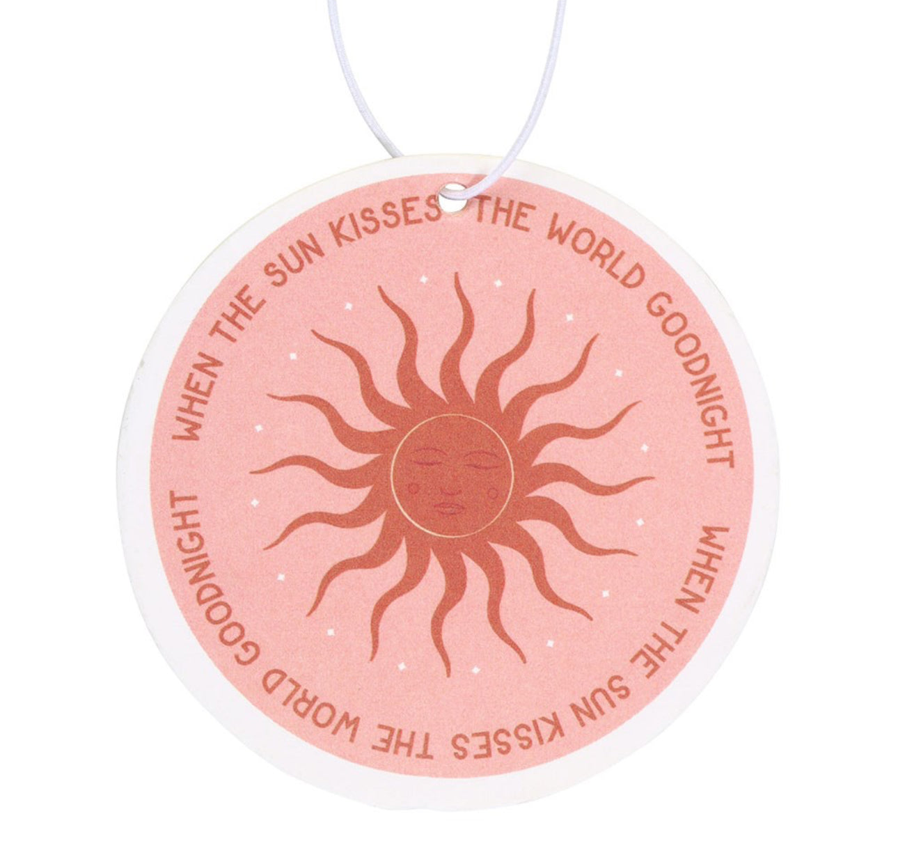 Captura la calidez del anochecer con este ambientador de hora dorada. Con un diseño de sol contemporáneo y la frase "Cuando el sol besó al mundo buenas noches", este ambientador con aroma floral agregará un toque de calma y belleza a cada viaje en automóvil.