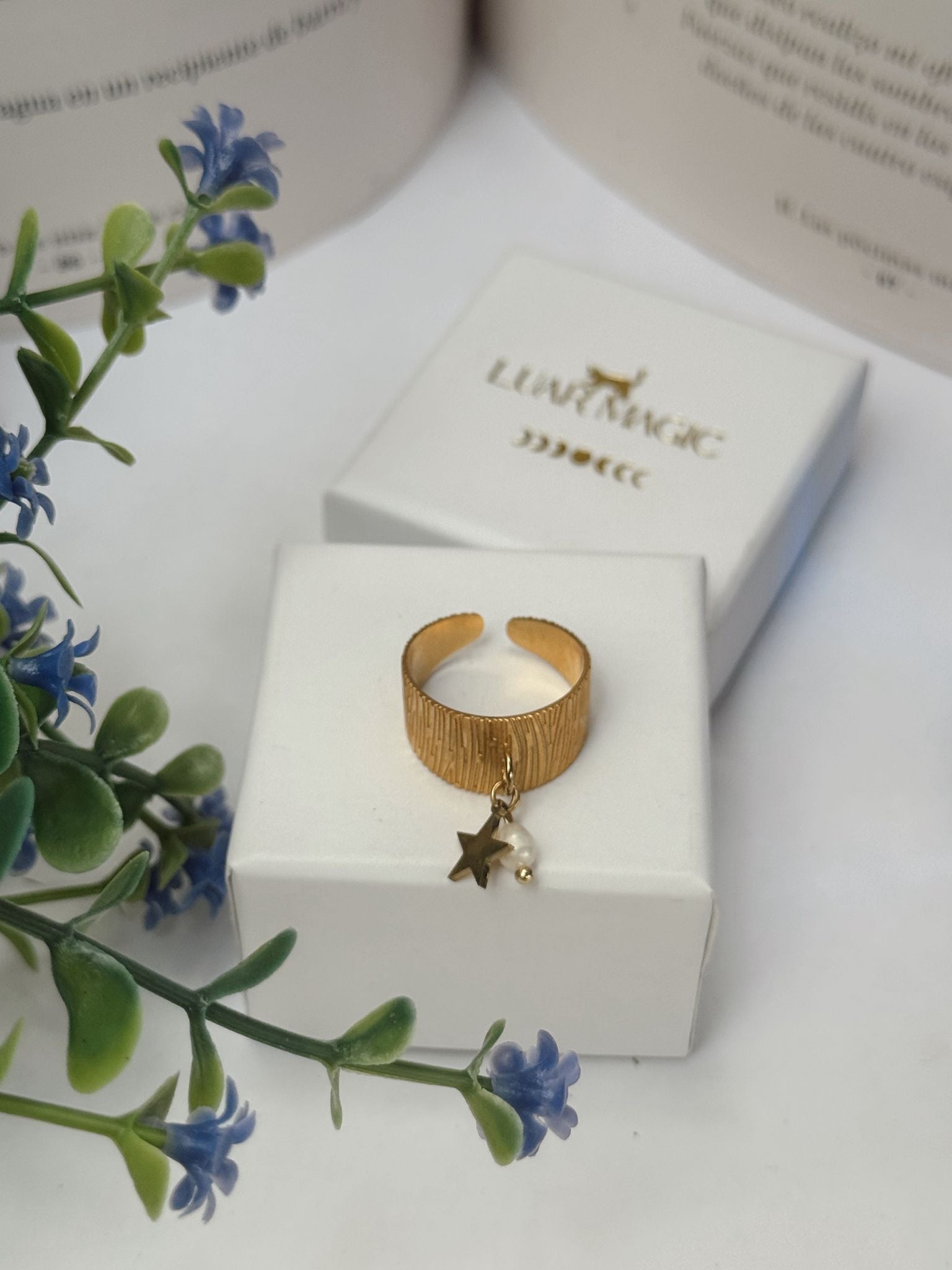 Anillo elaborado en acero inoxidable hipoalergénico, con un diseño ajustable que lo hace cómodo y versátil. La pieza combina una delicada perla de río natural con el símbolo de la estrella, creando una joya llena de encanto y armonía.