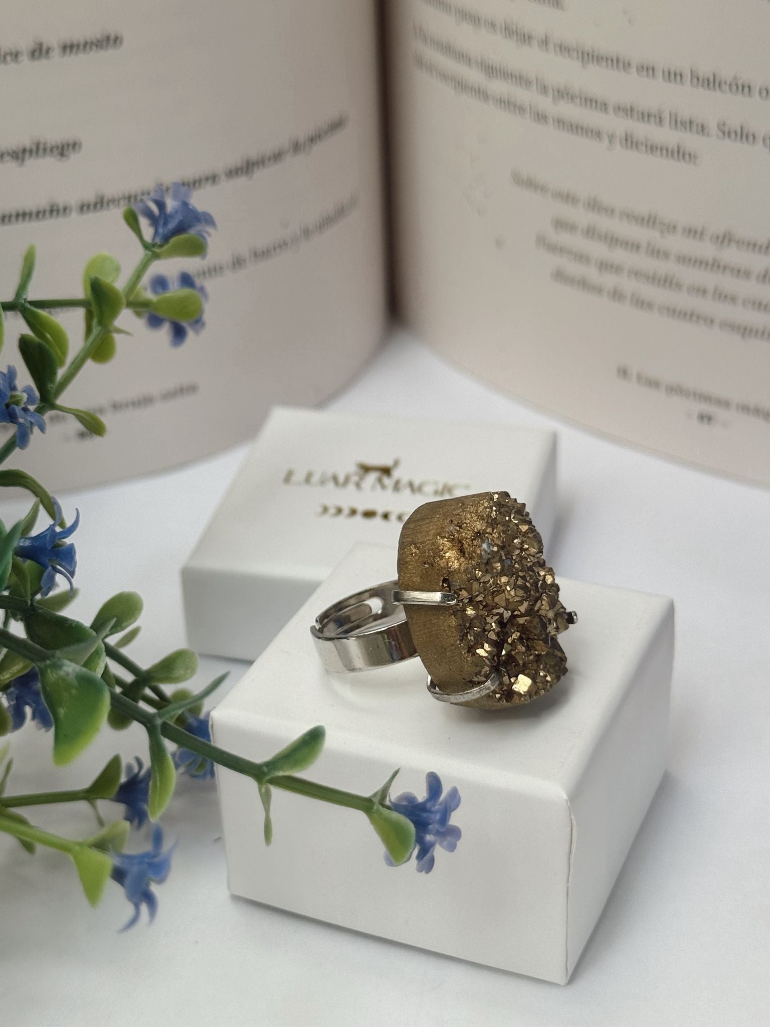 El acero inoxidable aporta resistencia, brillo y comodidad en el uso diario, además de ser un material duradero y seguro para la piel. Cada pieza es única gracias a las formas y destellos naturales del mineral, lo que convierte a este anillo en una joya especial y exclusiva.