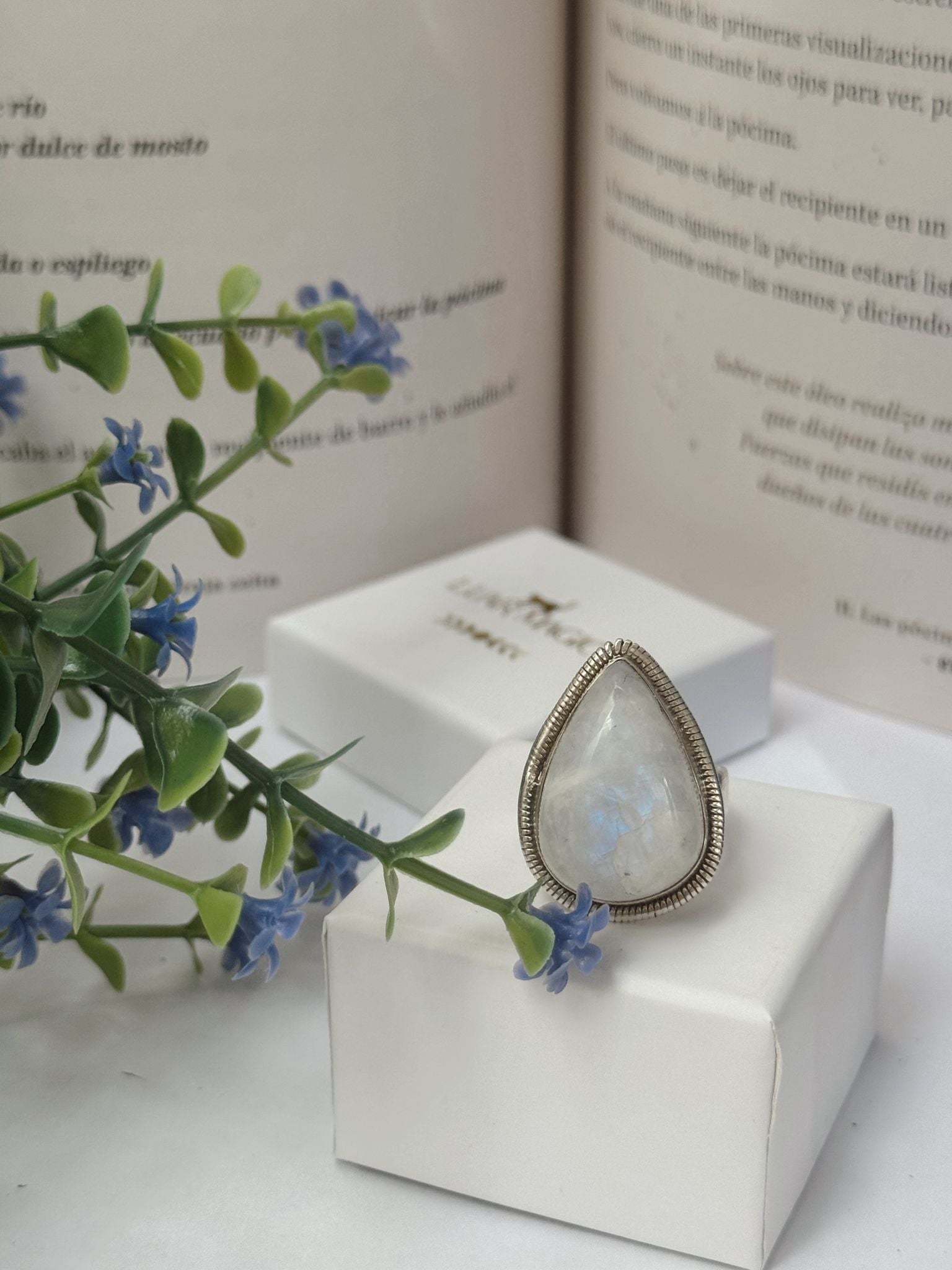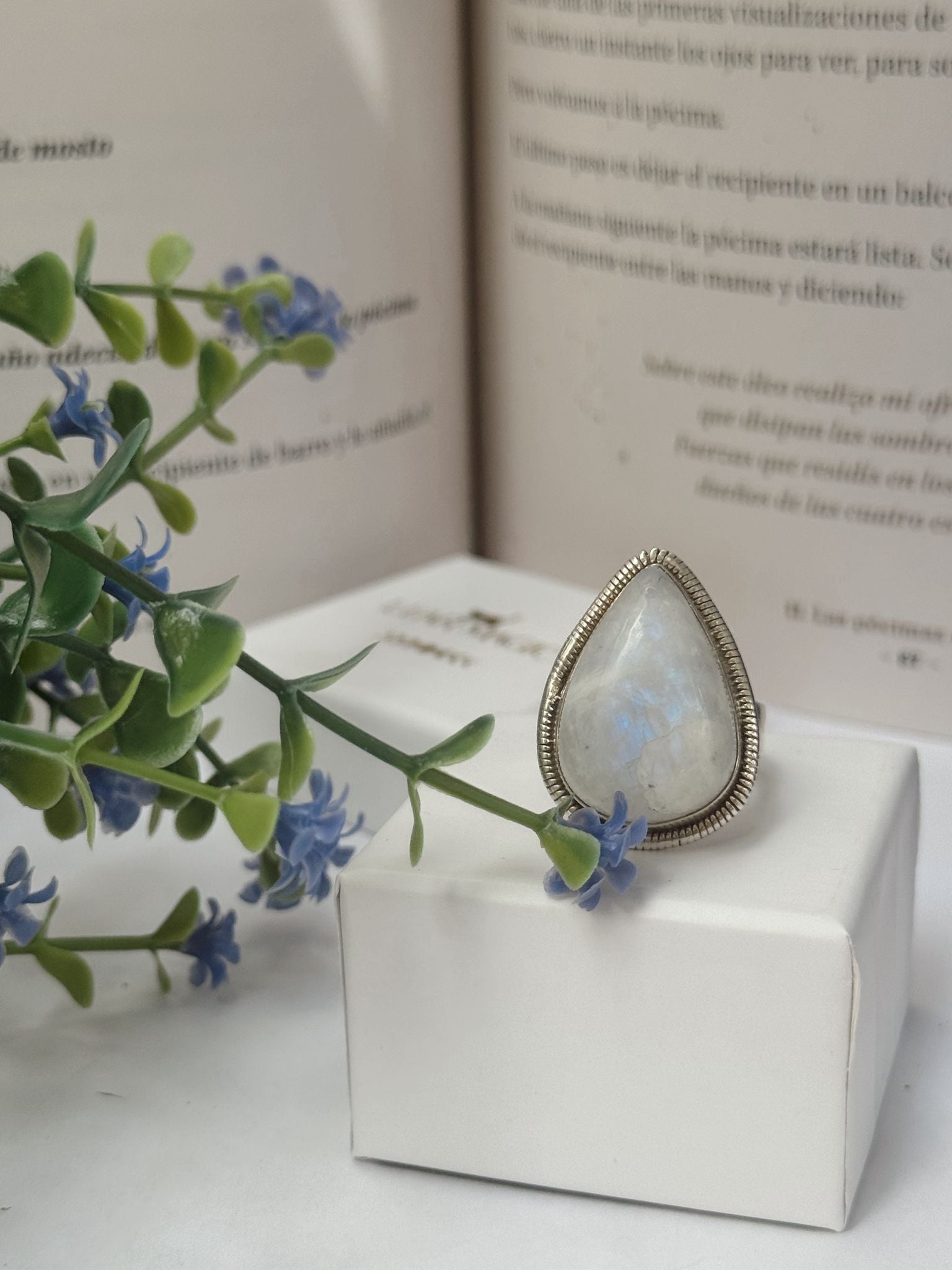 Anillo de piedra luna elaborado en plata de ley 925, con diseño ajustable para adaptarse cómodamente a cualquier medida. La piedra luna, con sus reflejos nacarados e irisados, aporta un brillo suave y mágico que lo convierte en una joya especial y única.