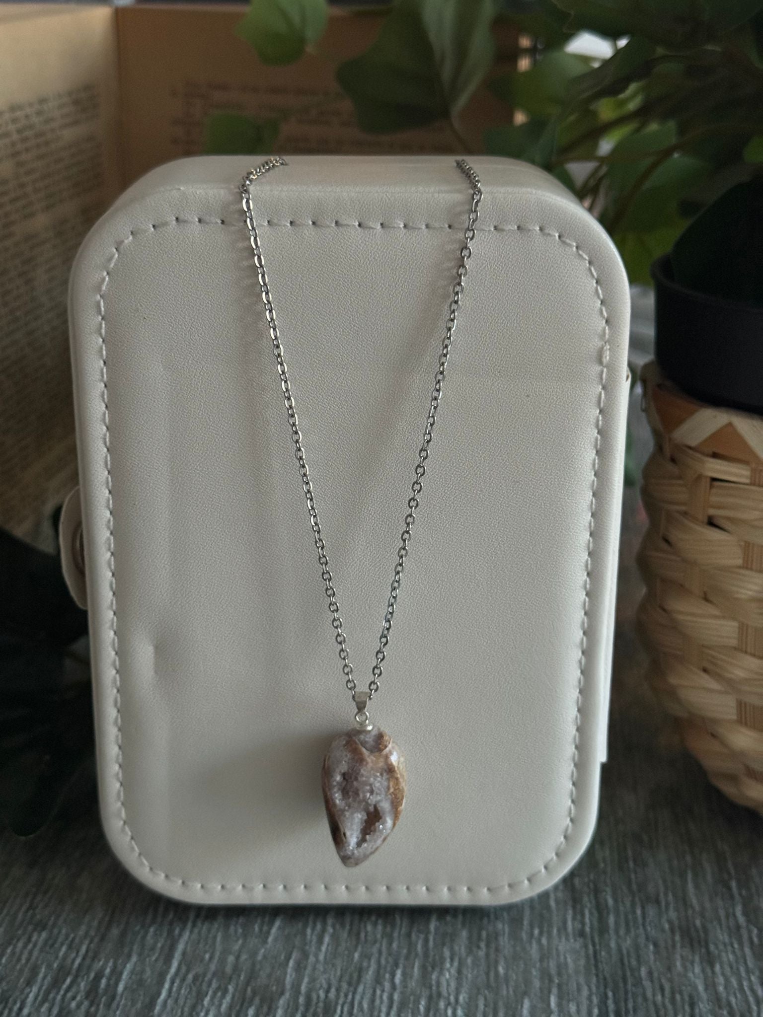 El Colgante Concha de Mar con Drusa de Cuarzo es una pieza mágica que combina la energía suave y fluida del mar con la vibración elevada del cuarzo natural. La concha conserva sus formas orgánicas y únicas, mientras que la drusa de cuarzo aporta brillo, luz y una poderosa capacidad de purificación y amplificación energética.