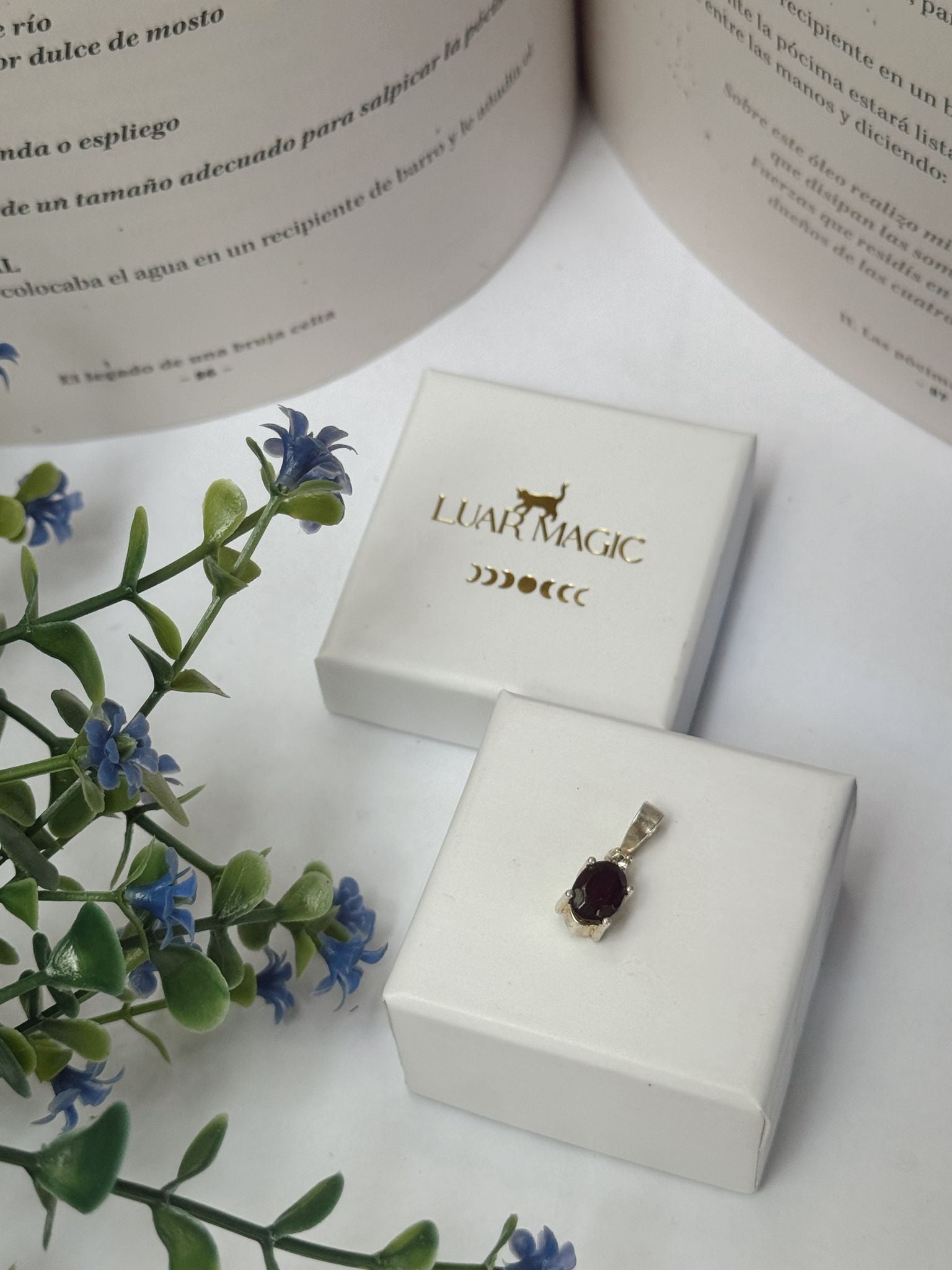 Un colgante exclusivo realizado artesanalmente por nosotros, elaborado con auténtico granate natural engastado en plata de ley 925. Cada pieza es única, trabajada con dedicación para resaltar la intensidad y el brillo del mineral.