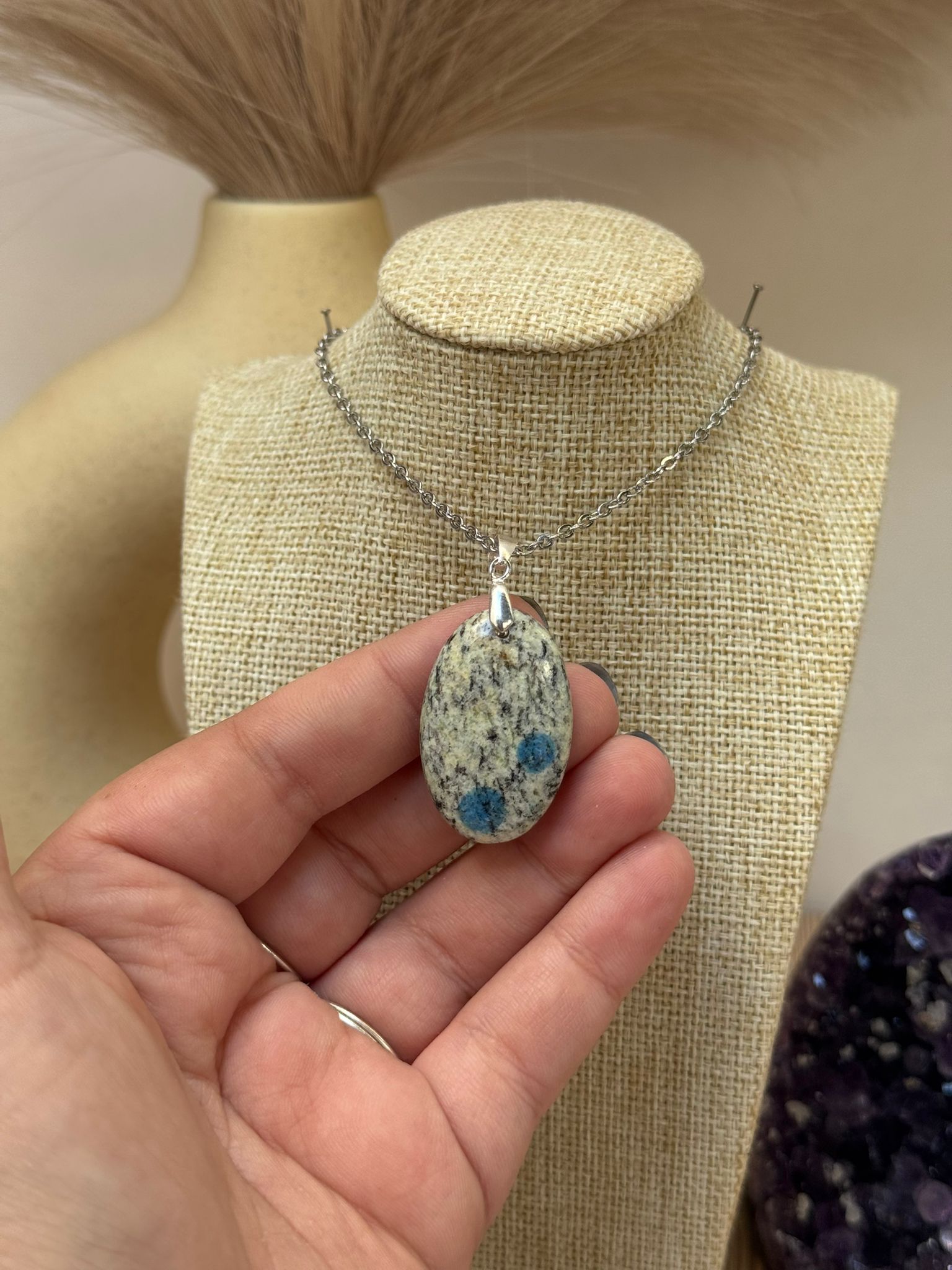 El Colgante de Plata 925 con Mineral K2 es una joya única que combina la elegancia de la plata con la energía mística de una de las piedras más especiales del mundo. El K2, también conocido como "piedra K2" o "jaspe K2", proviene de la base del monte K2 en Pakistán, y se caracteriza por su color blanco grisáceo salpicado de manchas azules naturales de azurita.