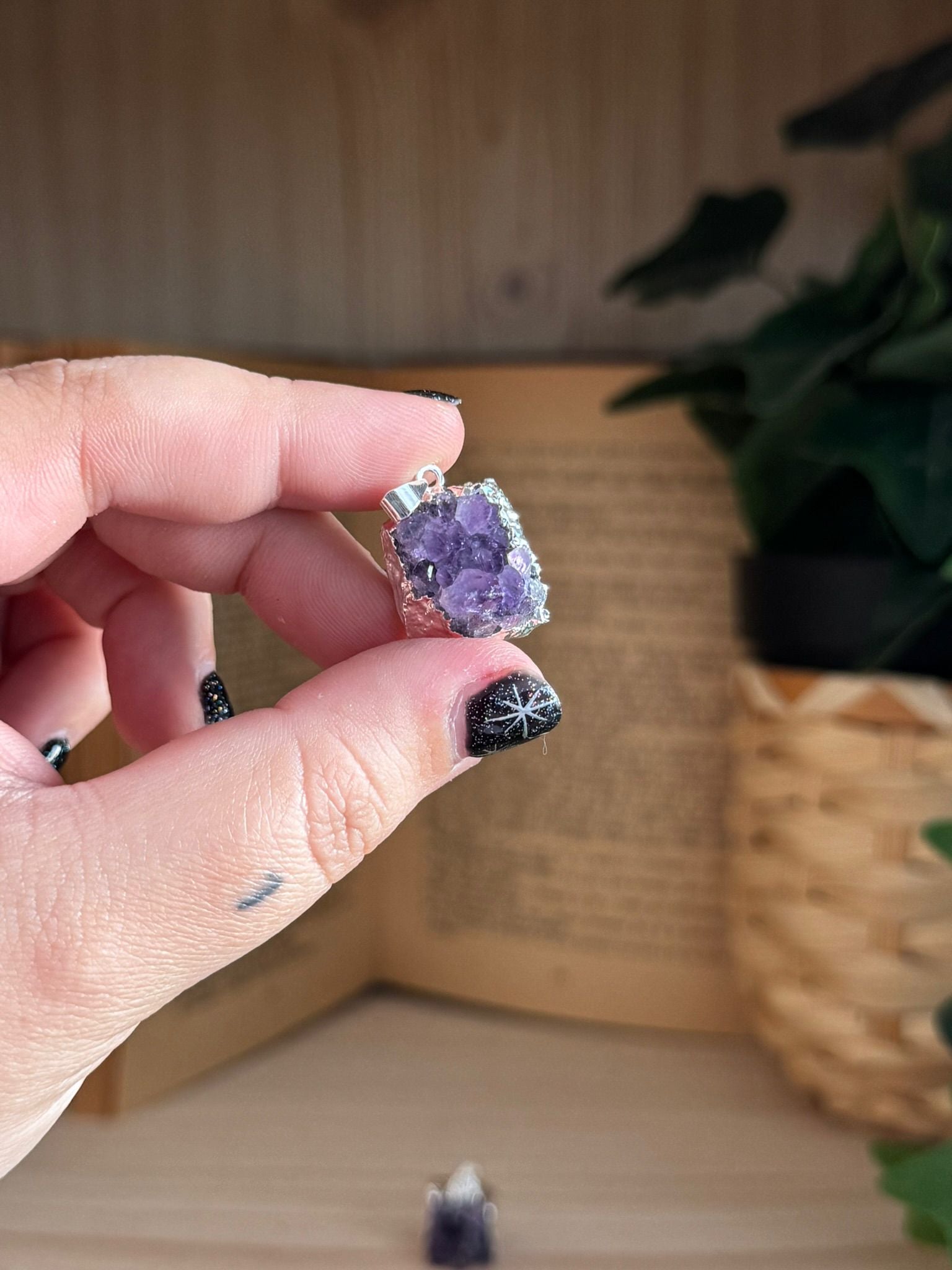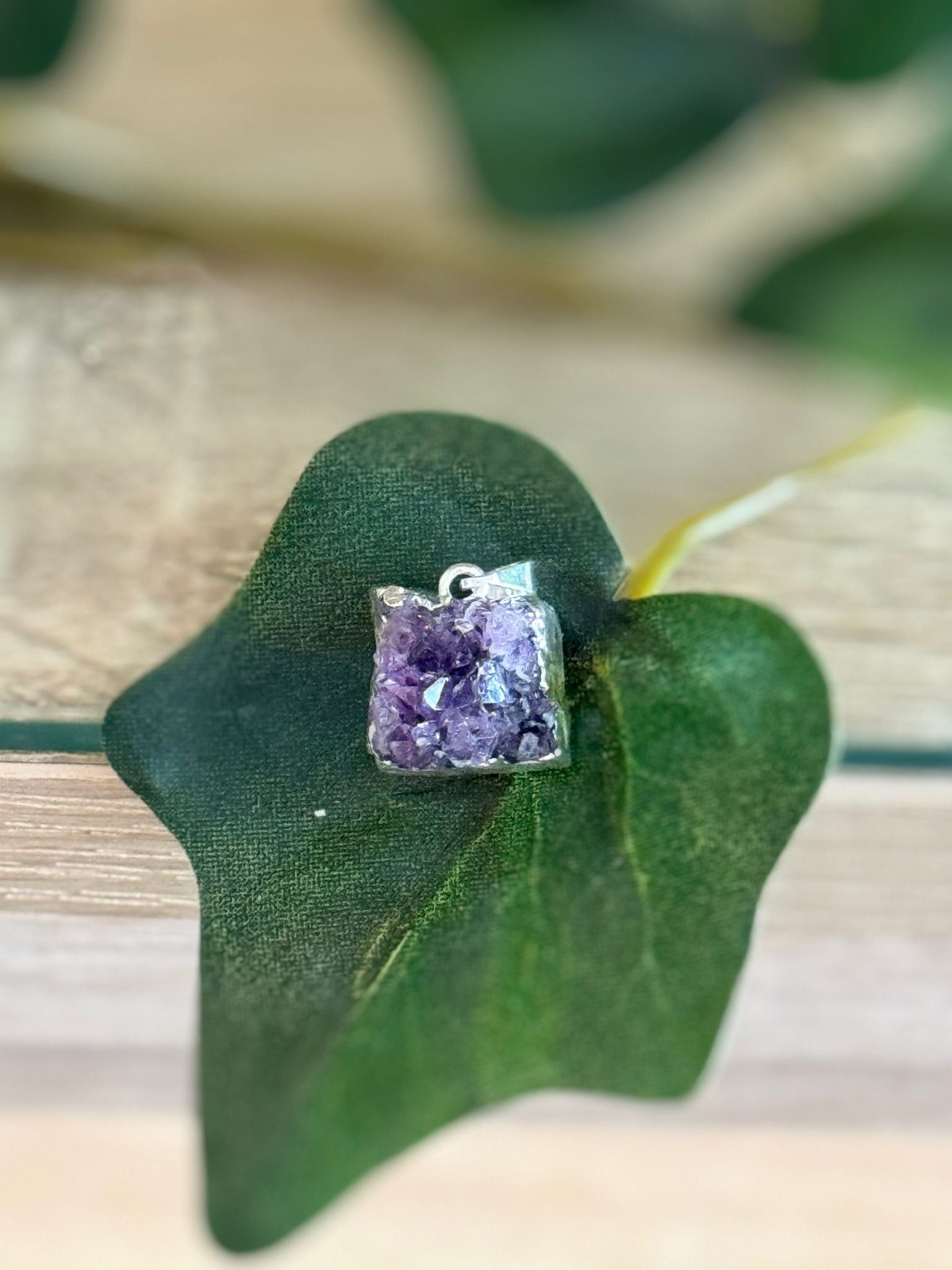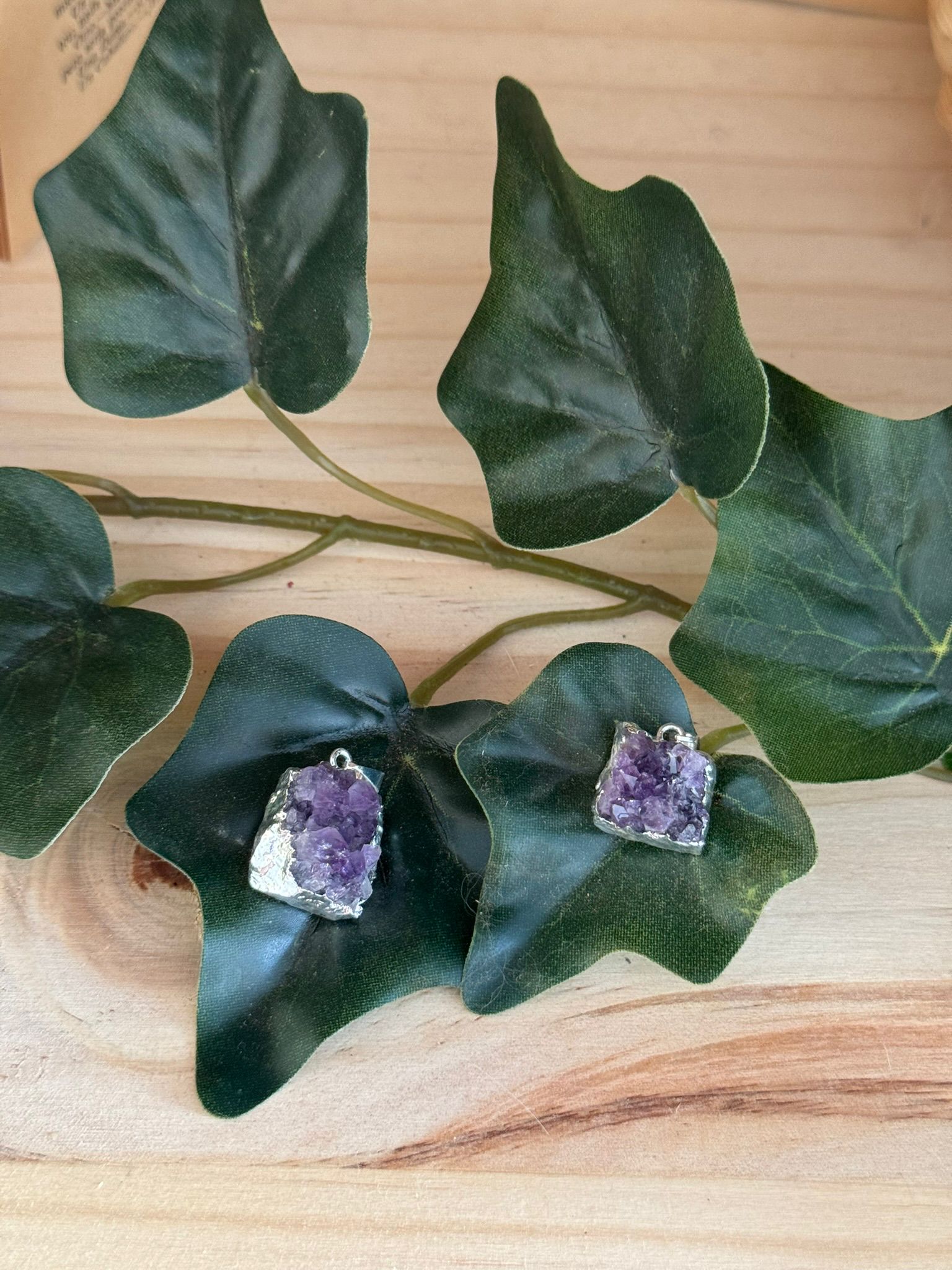 El Colgante de Drusa de Amatista con Baño de Plata es una pieza natural que combina la energía espiritual de la amatista con la elegancia del acabado metálico. La amatista es una piedra de protección, calma y conexión espiritual, ideal para armonizar el aura y fomentar la paz interior.
