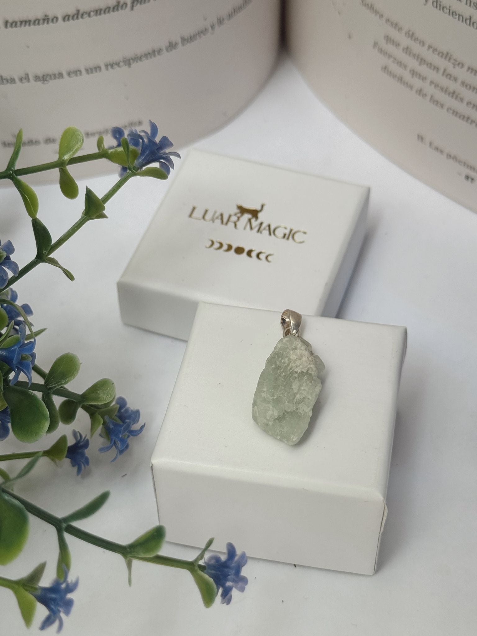 Colgante elaborado con una pieza de aguamarina natural en bruto, montada en plata de ley 925. Su diseño resalta la belleza auténtica y las formas irregulares del mineral, lo que convierte a cada colgante en una pieza única e irrepetible.