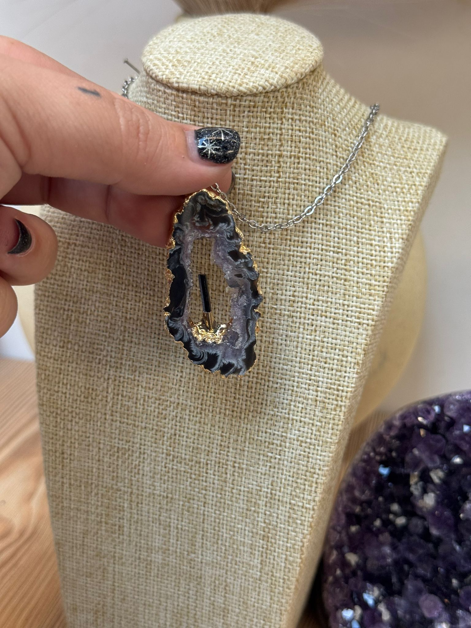 Colgante Geodino de Ágata con Drusa de Cuarzo Blanco y Turmalina Negra en Plata 925