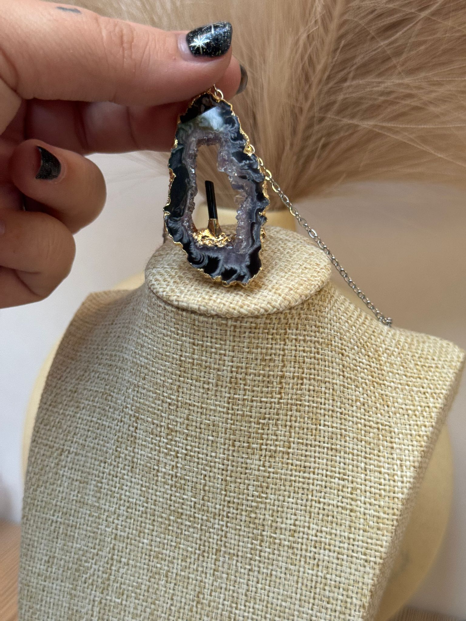 Material: Ágata natural con drusa de cuarzo blanco y turmalina negra, montado en plata de ley 925