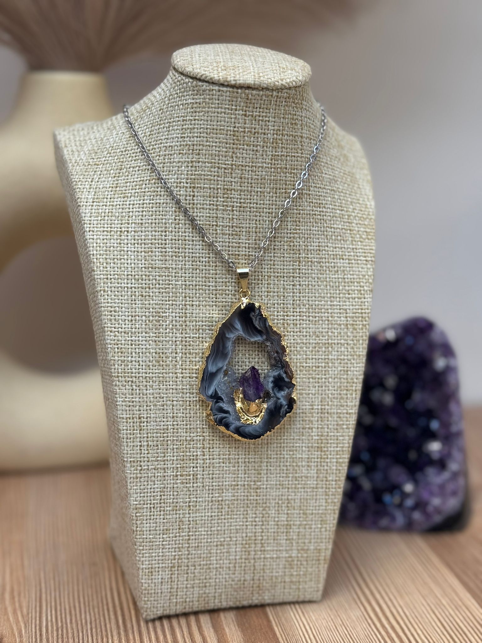 Colgante Geodino de Ágata con Drusa de Cuarzo y Amatista en Punta