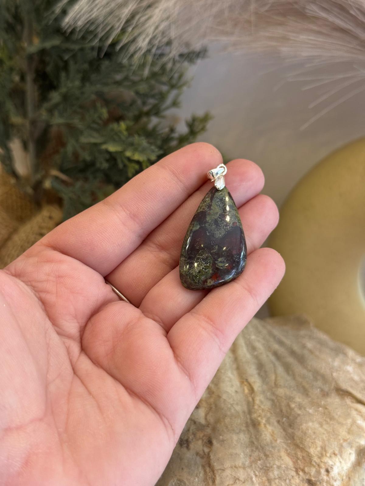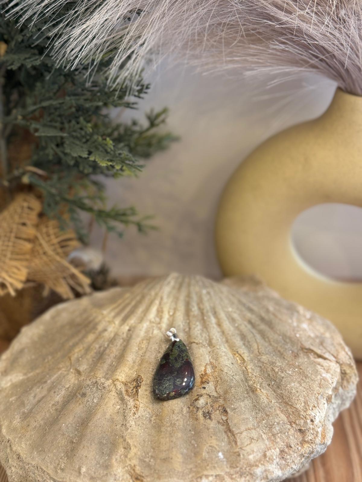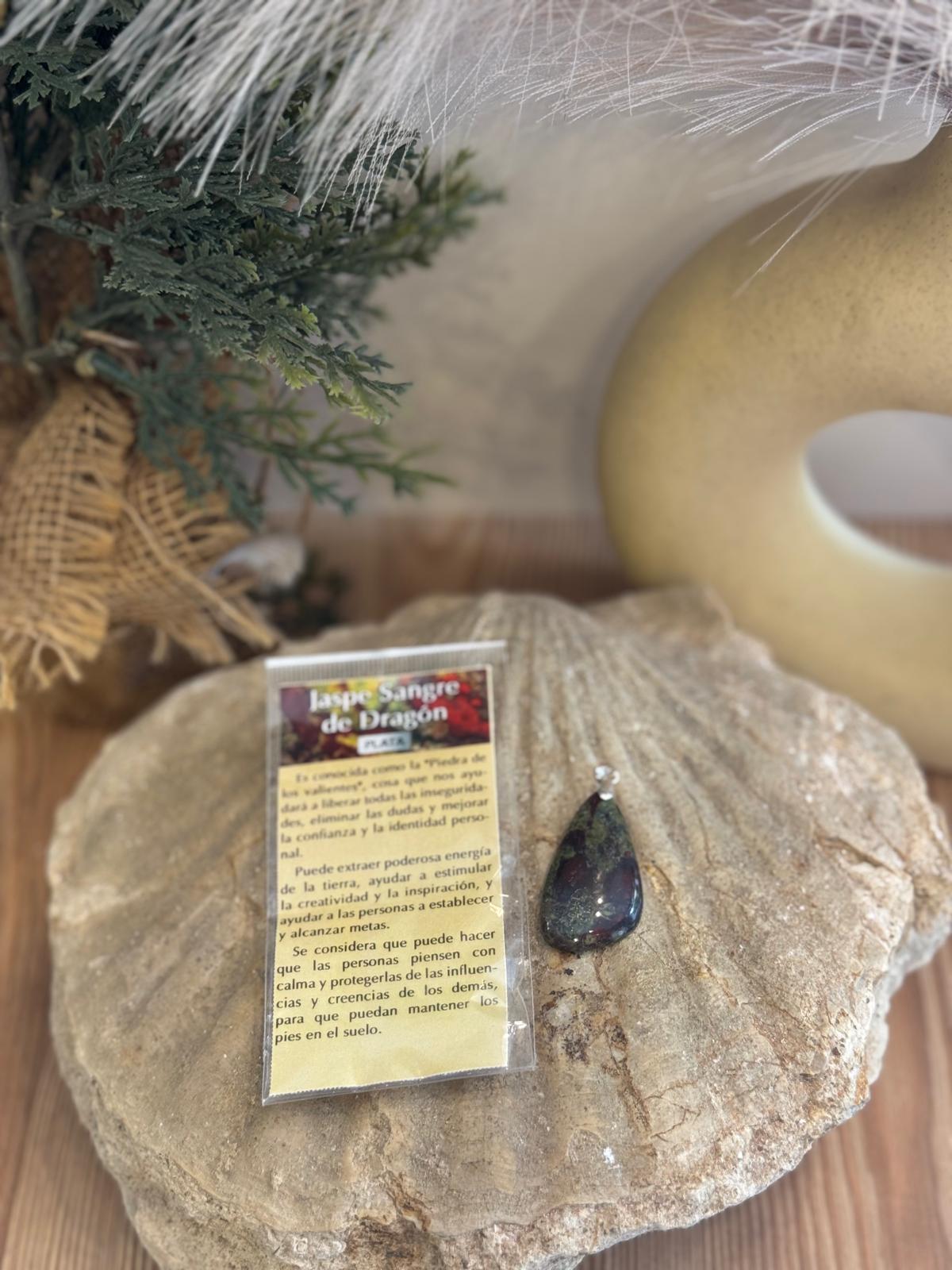 El Colgante Sangre de Dragón está elaborado en plata 925 y engarzado con piedra natural Bloodstone o Sangre de Dragón, conocida por su energía de fuerza, vitalidad y protección. Esta piedra combina tonos verdes con vetas rojas naturales que simbolizan el poder del fuego y la renovación interior.