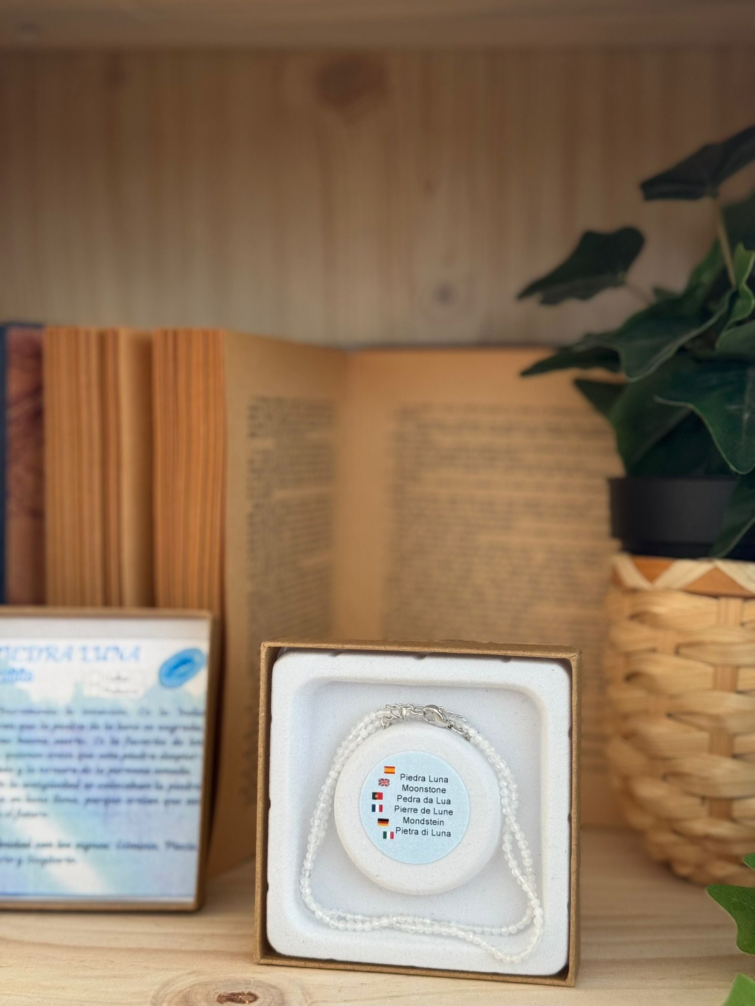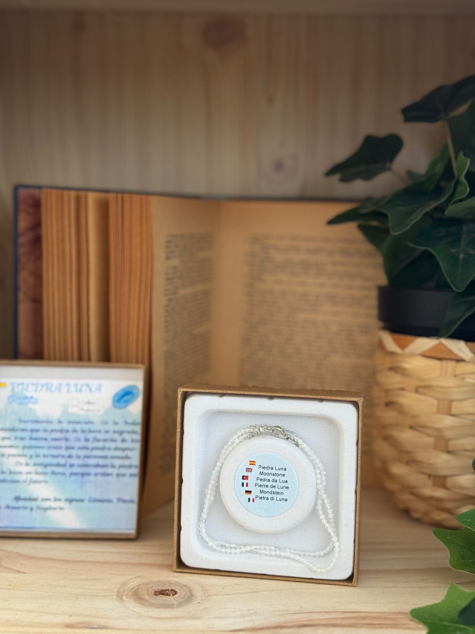 Cada pieza está cuidadosamente seleccionada por su brillo iridiscente y pureza, reflejando la luz con un tono mágico que simboliza la conexión con la luna.
