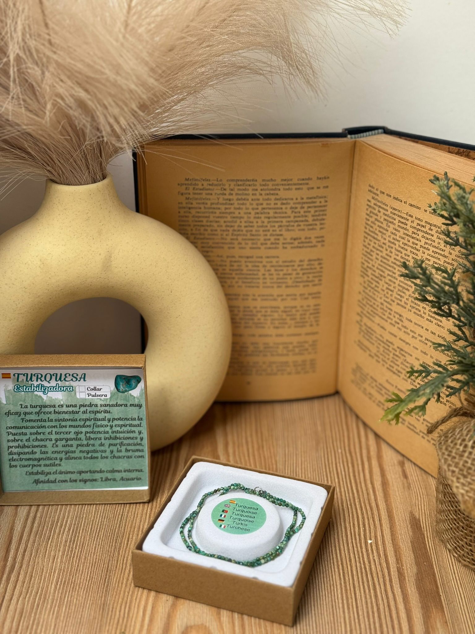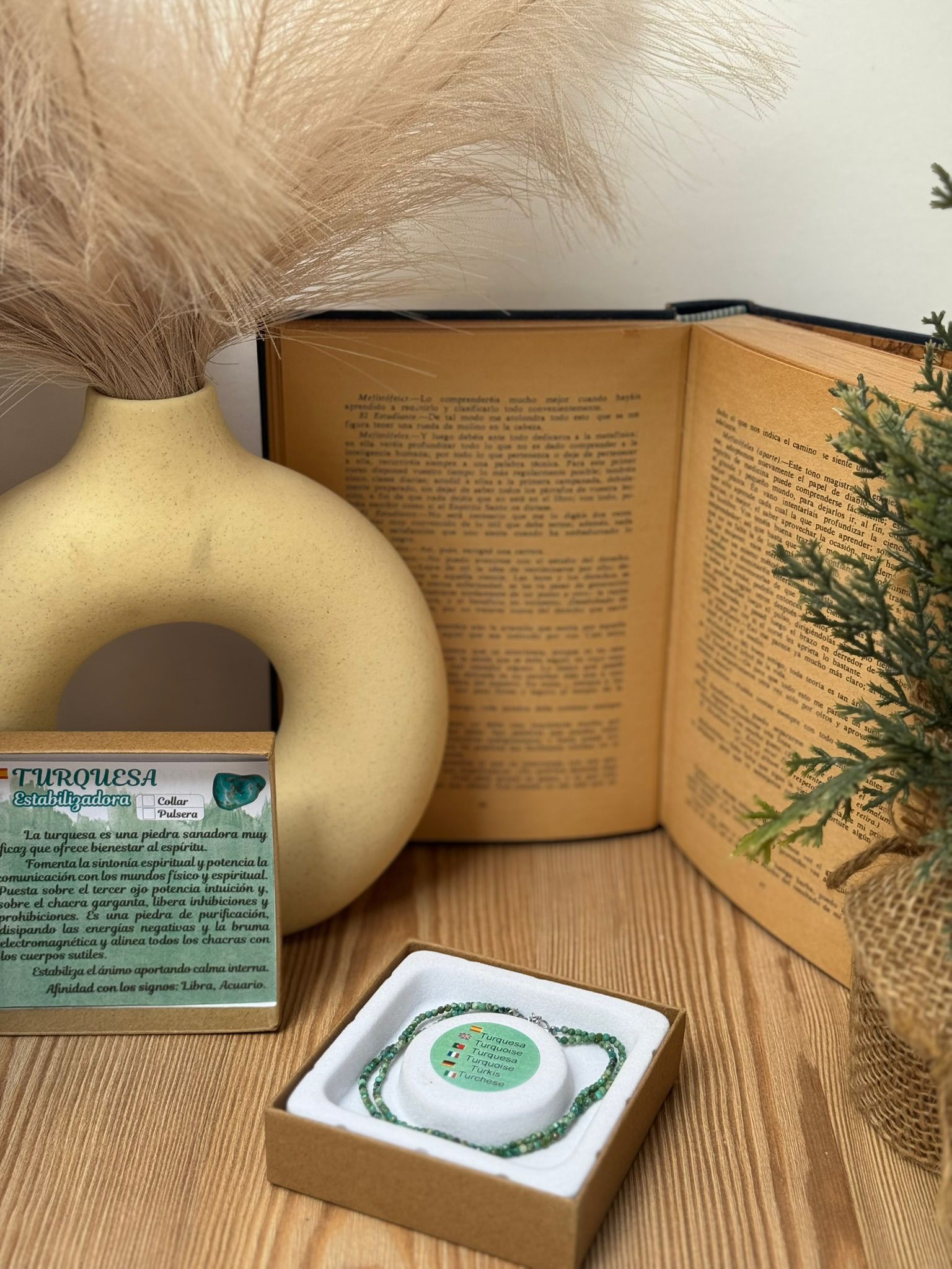 El Collar y Pulsera de Turquesa están elaborados con piedra natural de calidad extra, conocida por su vibración protectora y sanadora. La turquesa es un mineral sagrado utilizado desde la antigüedad como amuleto de buena suerte, comunicación clara y equilibrio espiritual.