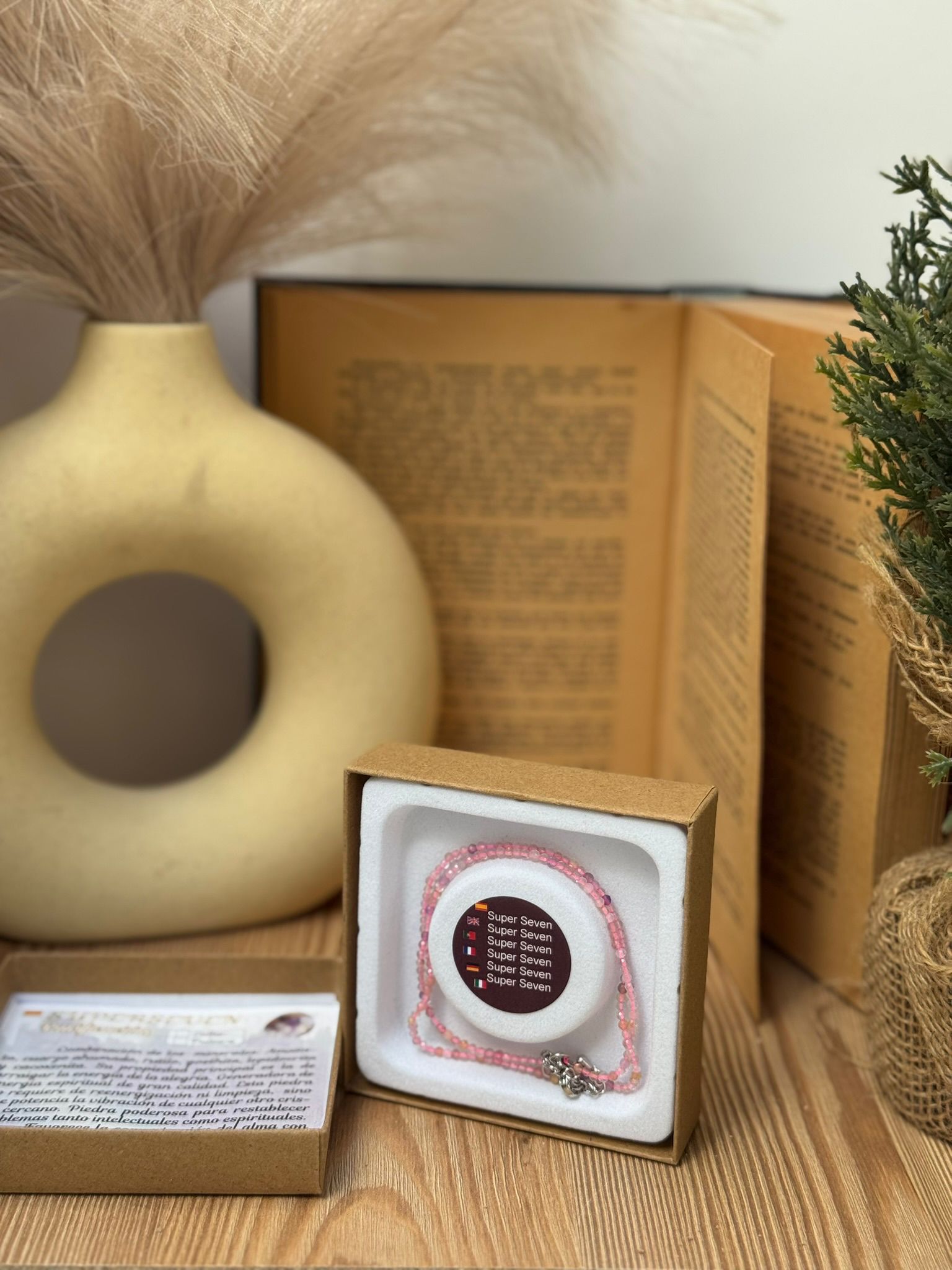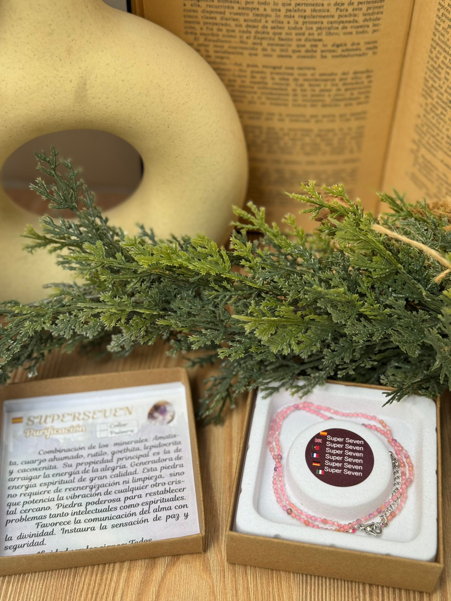 El Súper 7 armoniza los siete chakras, protege el aura y eleva la vibración espiritual. Favorece la conexión con la intuición, la claridad mental y la sanación energética profunda. Su brillo facetado potencia su luz natural, convirtiéndolo en un conjunto elegante y poderoso.