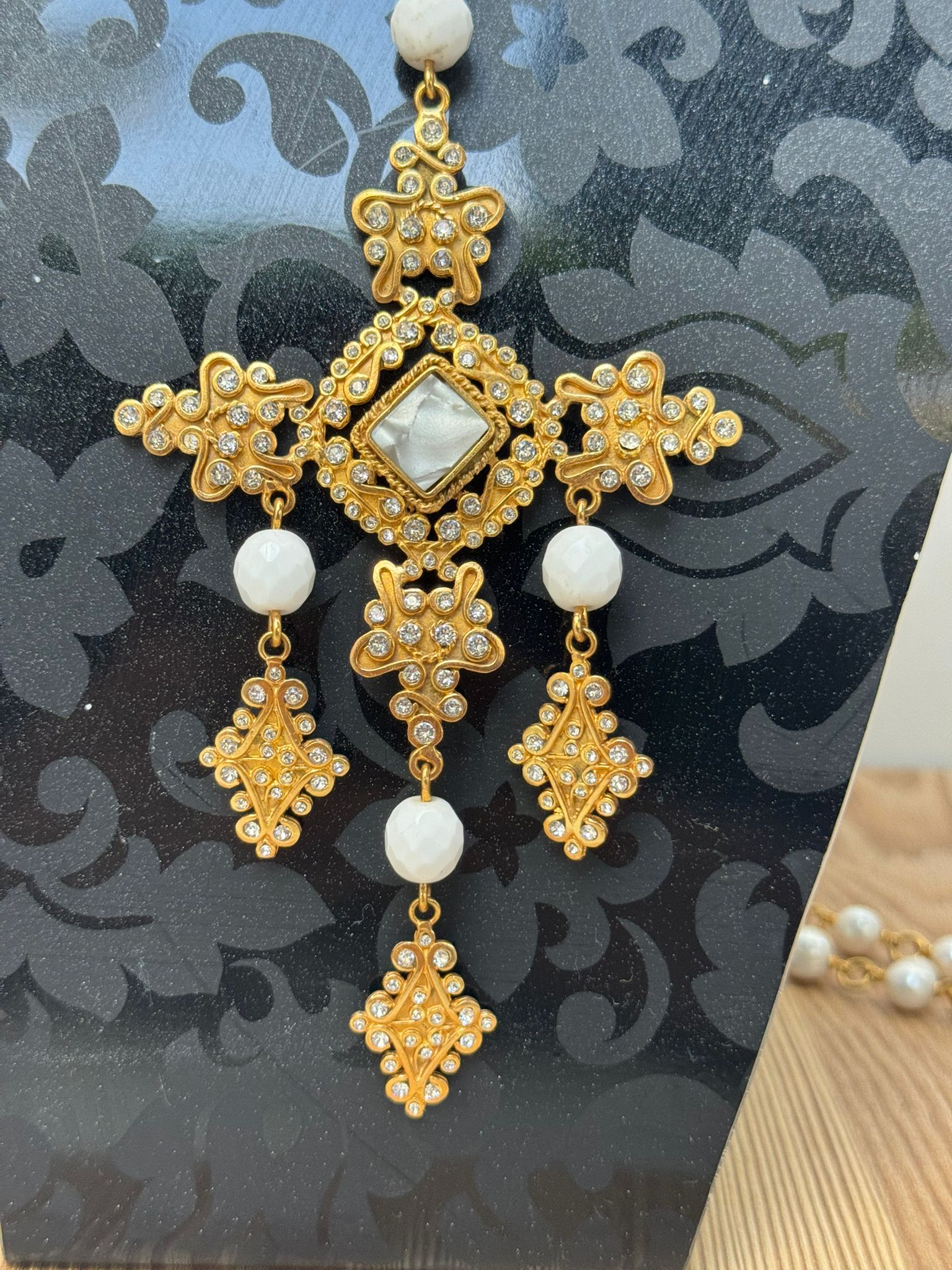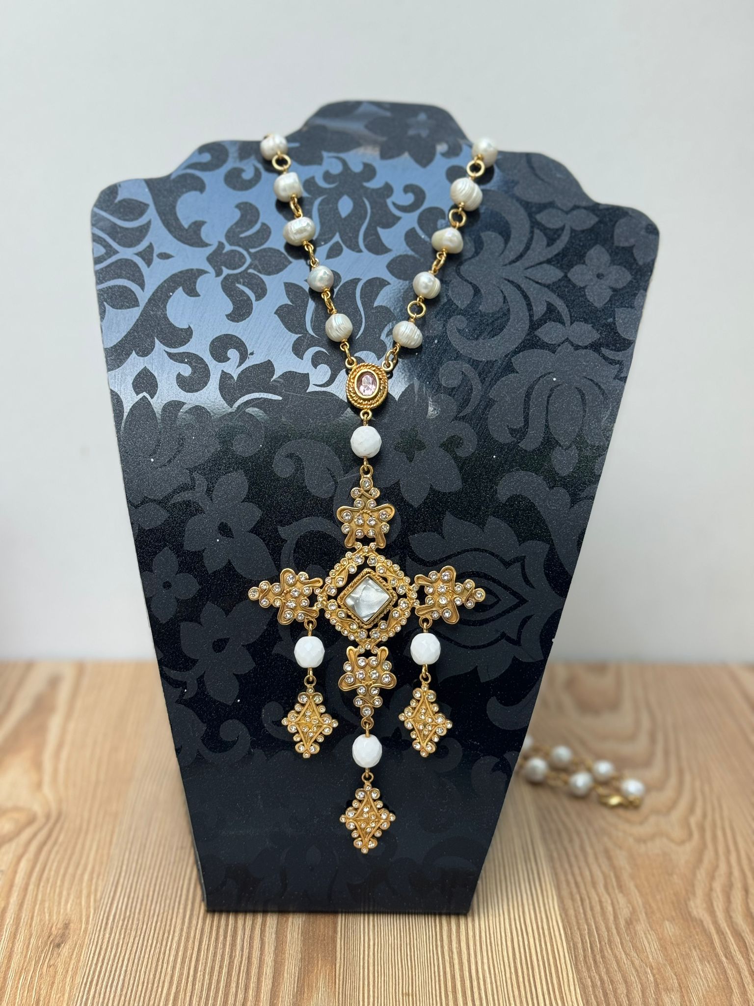 Cruz Bizantina con Colgante de Perlas de Río, Nácar, Ónix Blanco, Cuarzo Rosa y Circonitas