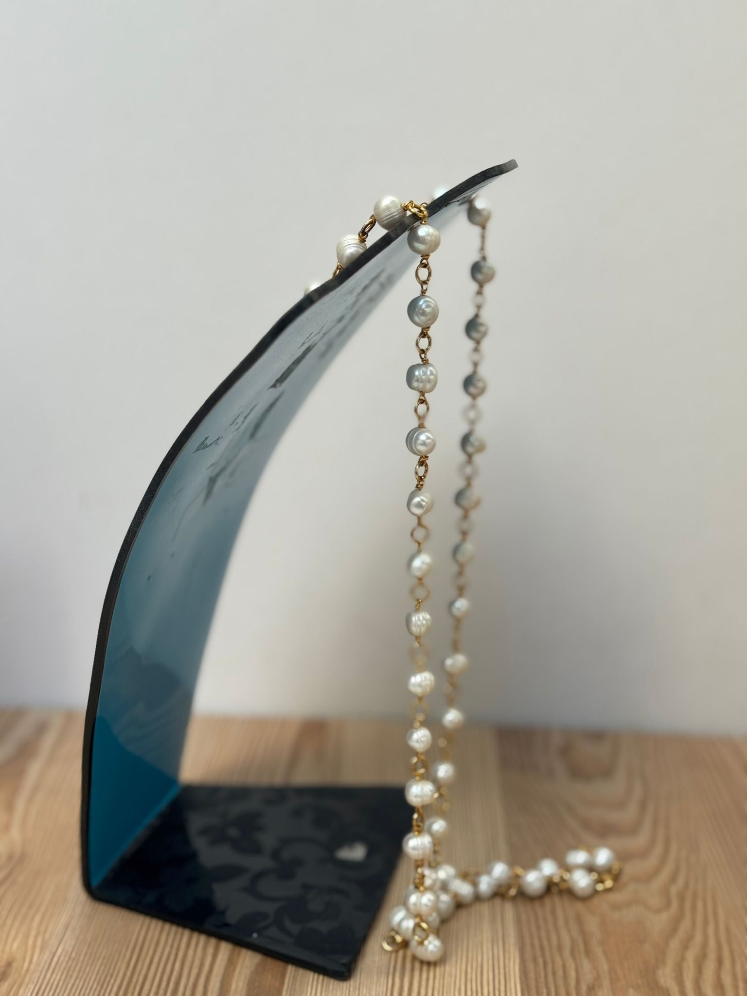 Materiales: Plata de ley 925 chapada en oro de 24 k, perlas de río, nácar, ónix blanco, cuarzo rosa y circonitas