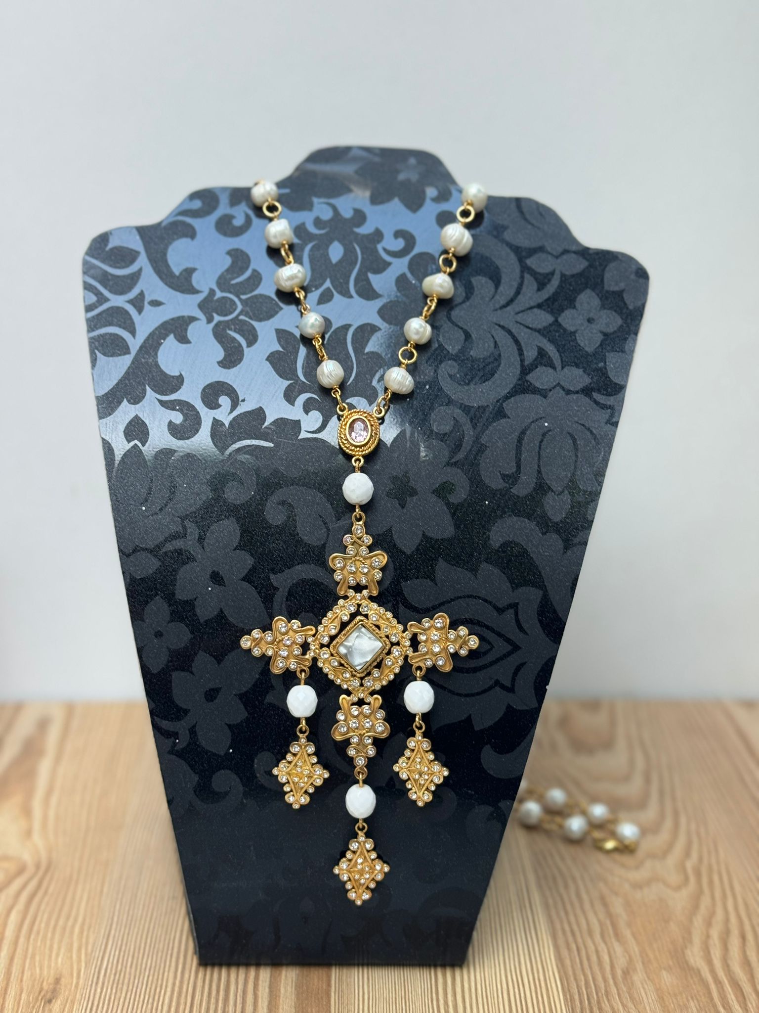 Cruz Bizantina con Colgante de Perlas de Río, Nácar, Ónix Blanco, Cuarzo Rosa y Circonitas (hecha a mano)