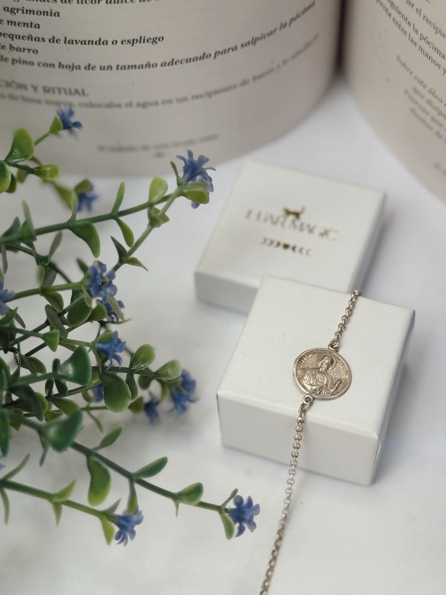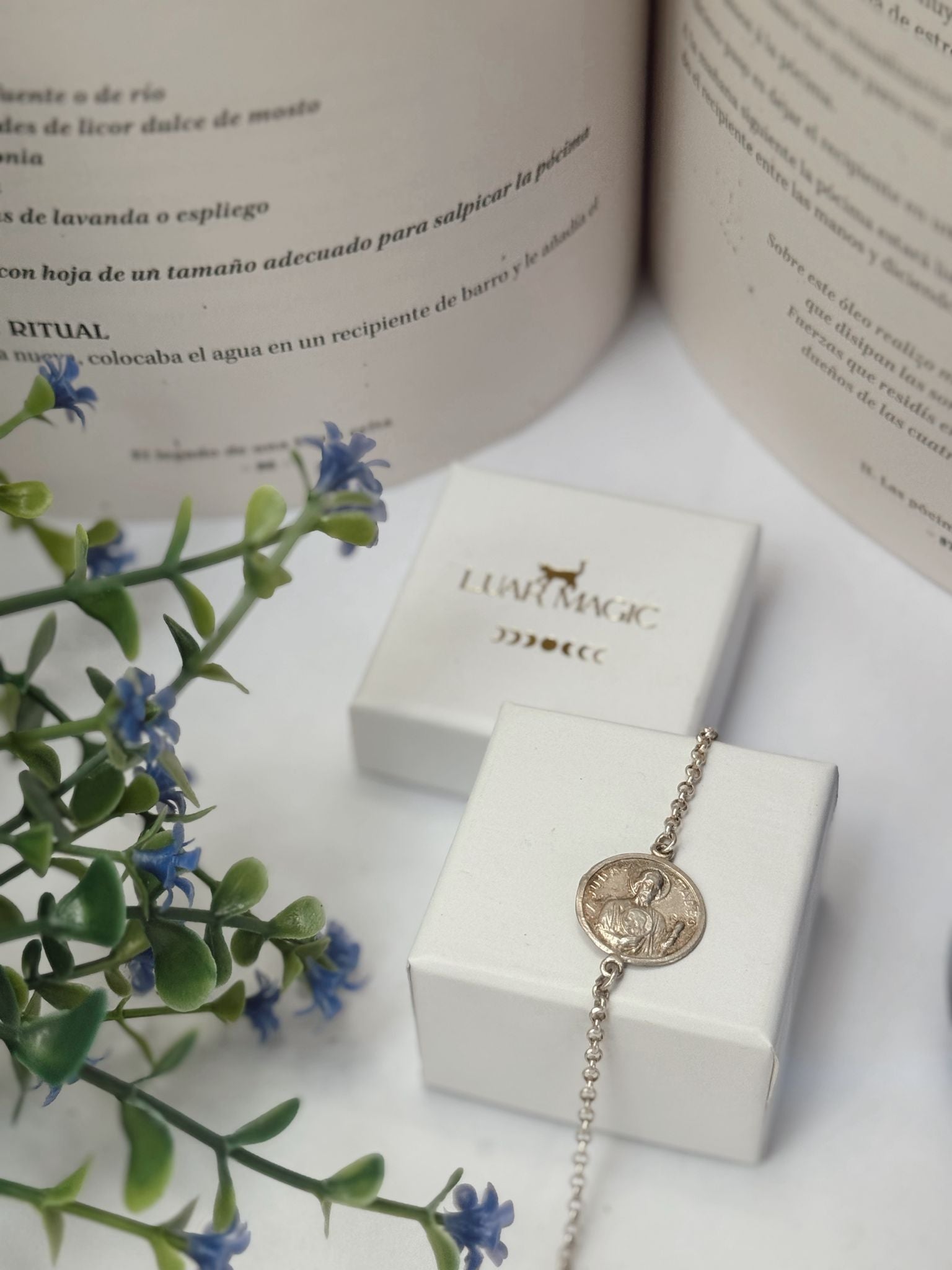 Pulsera elaborada en plata de ley 925 con la medalla de San Benito, símbolo de fe y protección. Su diseño elegante y resistente la convierte en una joya atemporal que puede acompañarte en el día a día como un poderoso amuleto espiritual.