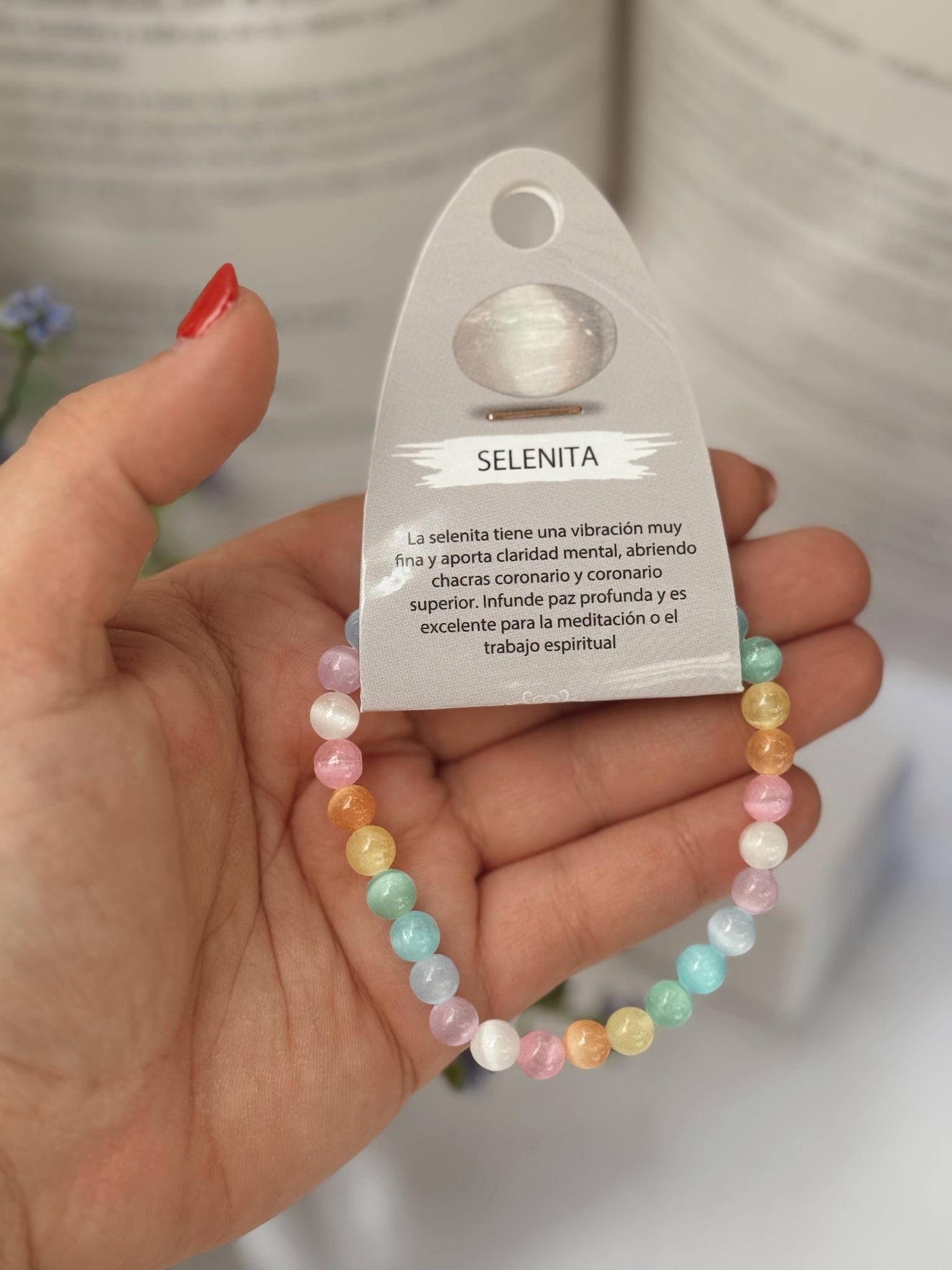 La pulsera multicolor combina la pureza de la selenita con un diseño alegre y armónico, convirtiéndola en un accesorio que no solo embellece, sino que también protege y eleva la energía de quien la lleva.