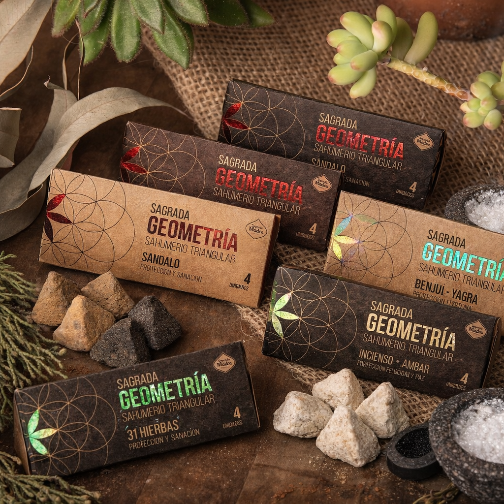 La línea Sagrada Geometría combina el poder ancestral de los sahumerios con la simbología sagrada de la geometría universal. Cada sahumerio triangular está elaborado para acompañar rituales de limpieza energética, meditación y bienestar espiritual, creando un ambiente de equilibrio, protección y conexión interior.
