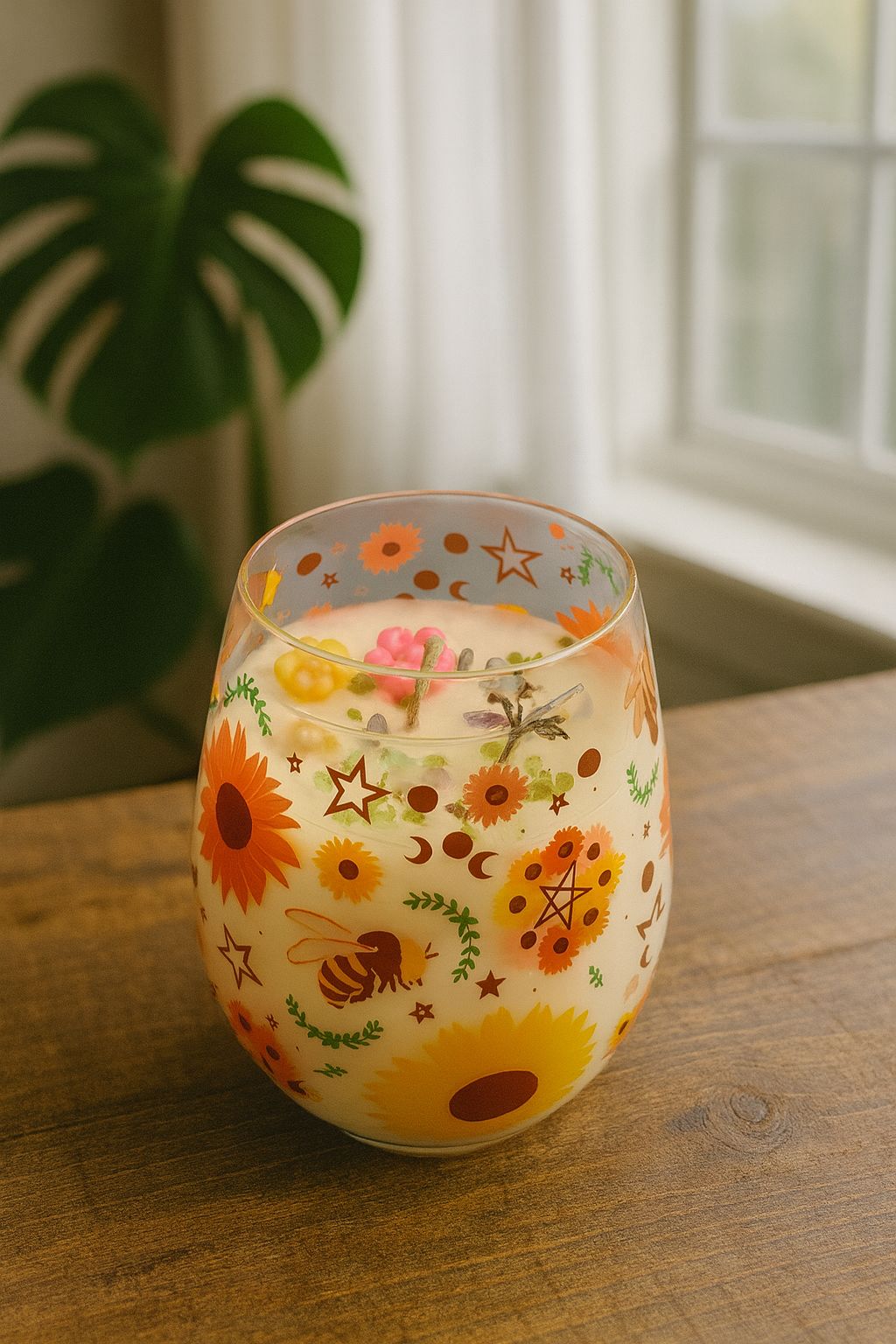 Déjate envolver por la energía del sol y la abundancia de la naturaleza con esta vela artesanal única. Elaborada en vaso de cristal decorado con girasoles, abejas y símbolos mágicos, transmite vitalidad, alegría y protección.