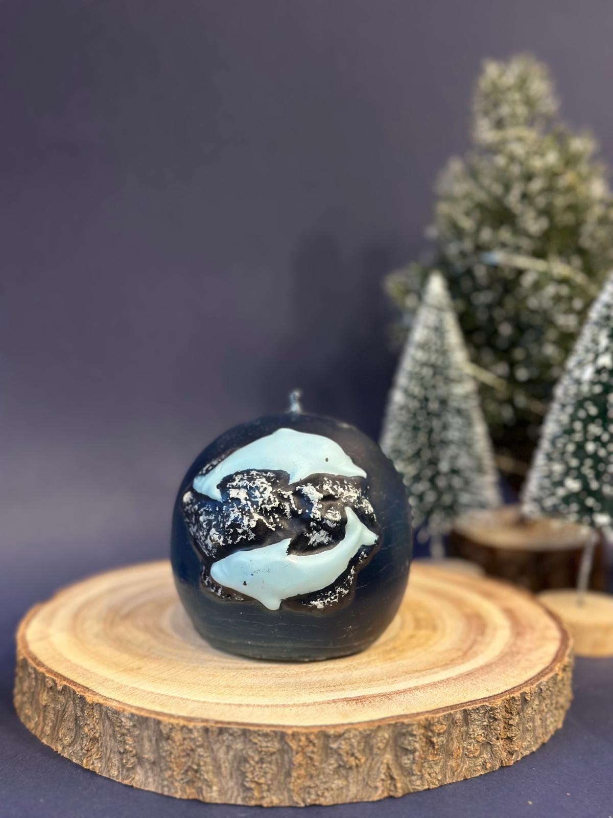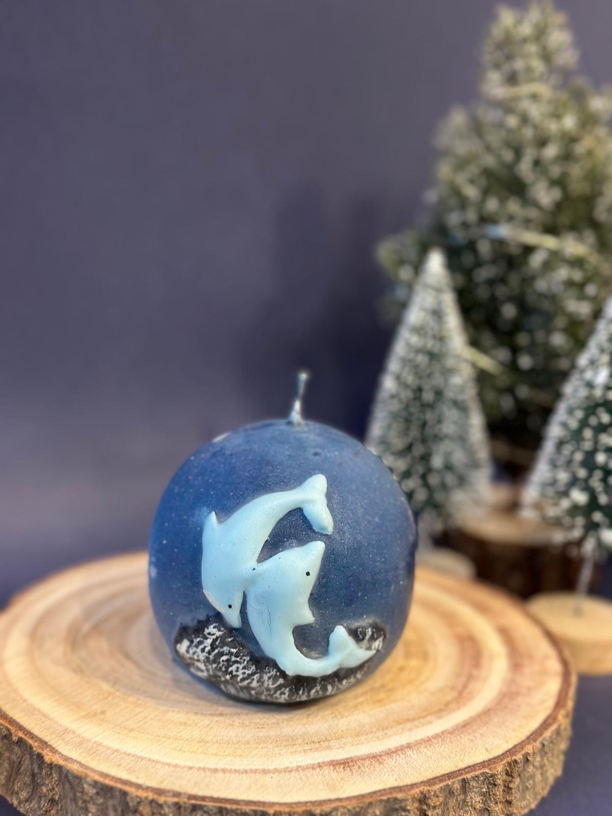 Material: vela decorativa esférica con relieve de peces en tonos marinos