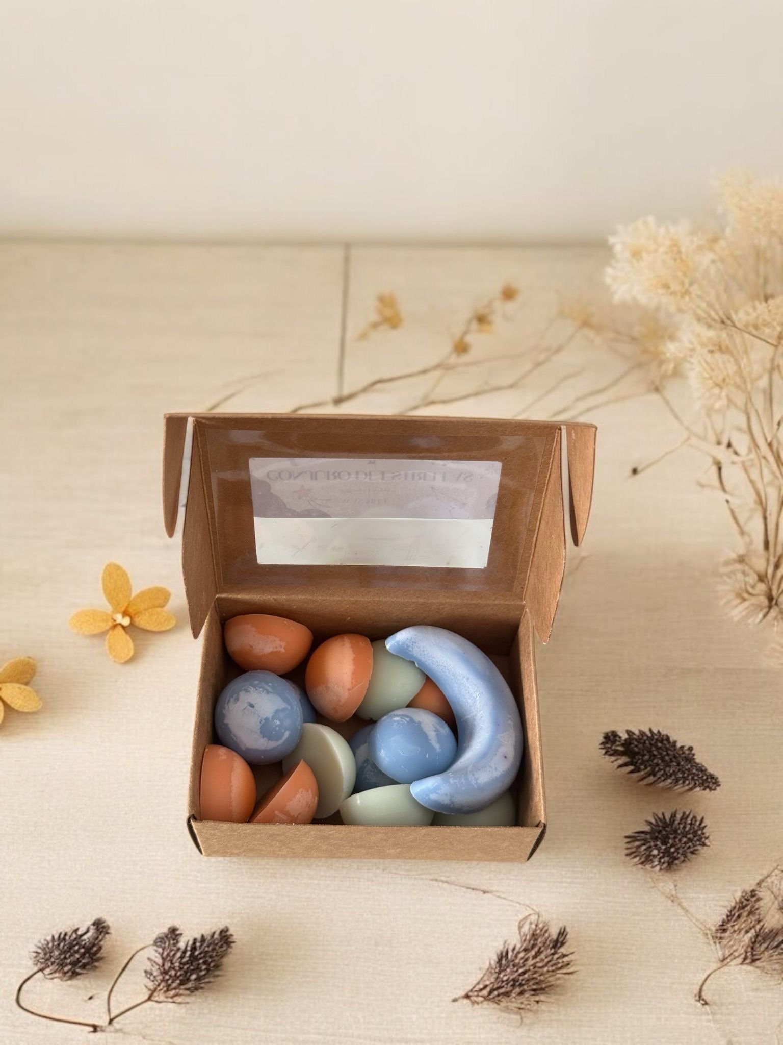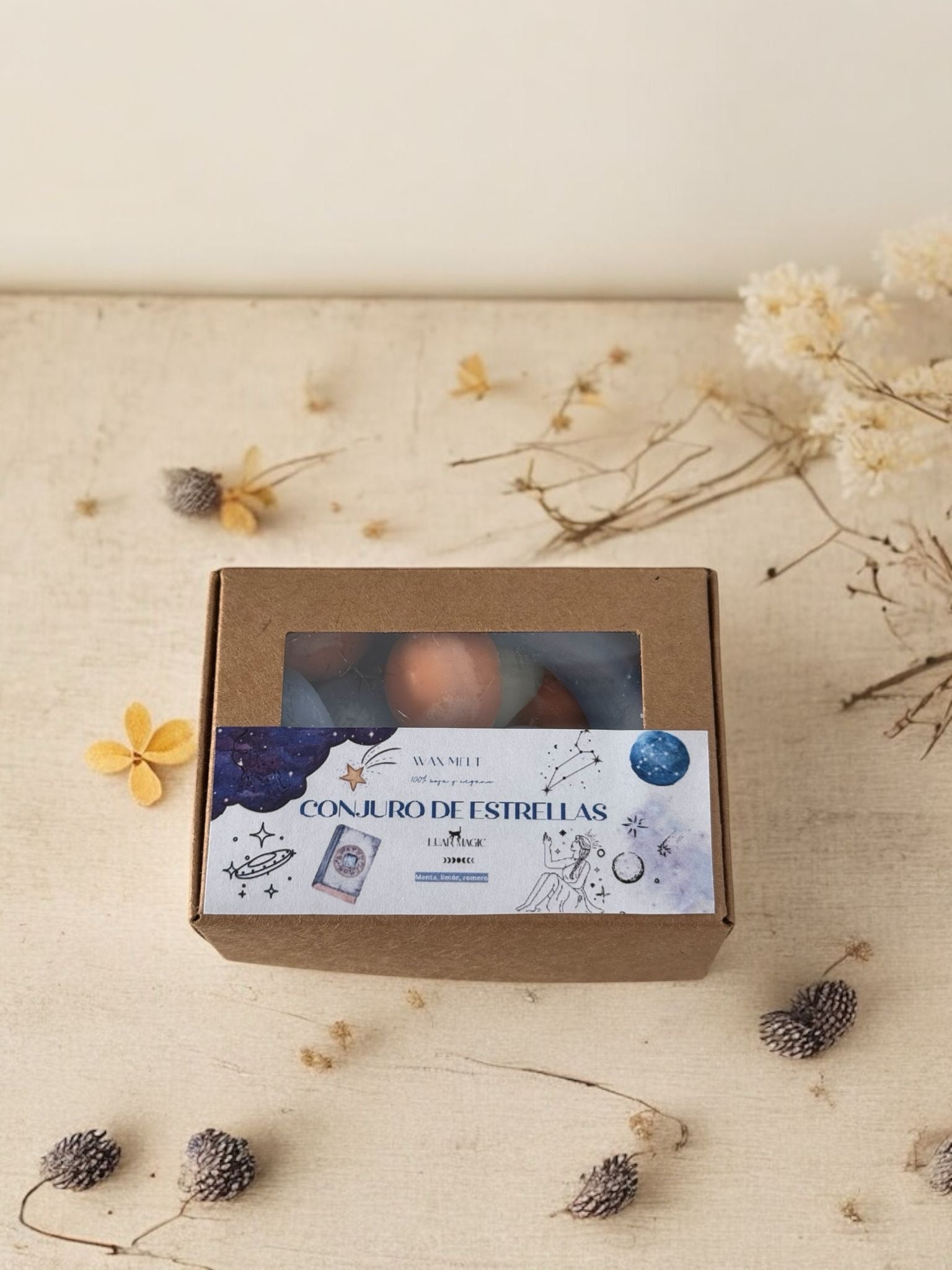 Déjate hechizar por el aroma celestial de Conjuro de Estrellas, nuestros wax melts artesanales elaborados a mano con cera de soja 100% natural. Cada caja contiene 60 gramos de pura magia perfumada, diseñada para llenar tu hogar de energía mística y calidez durante aproximadamente un mes y medio.