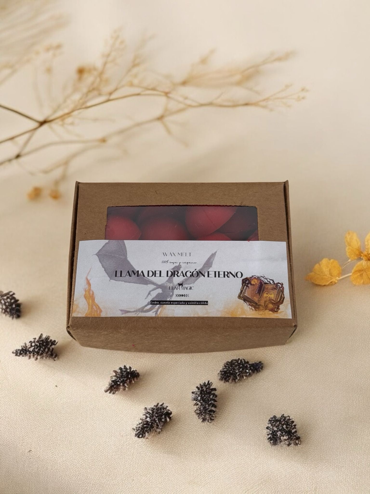 Despierta la energía ancestral del fuego con nuestros wax melts artesanales Llama del Dragón Eterno. Hechos a mano con dedicación y cera de soja 100% natural, cada caja contiene 60 gramos de poder aromático que arderá suavemente en tu espacio durante un mes y medio, liberando una fragancia intensa y envolvente.